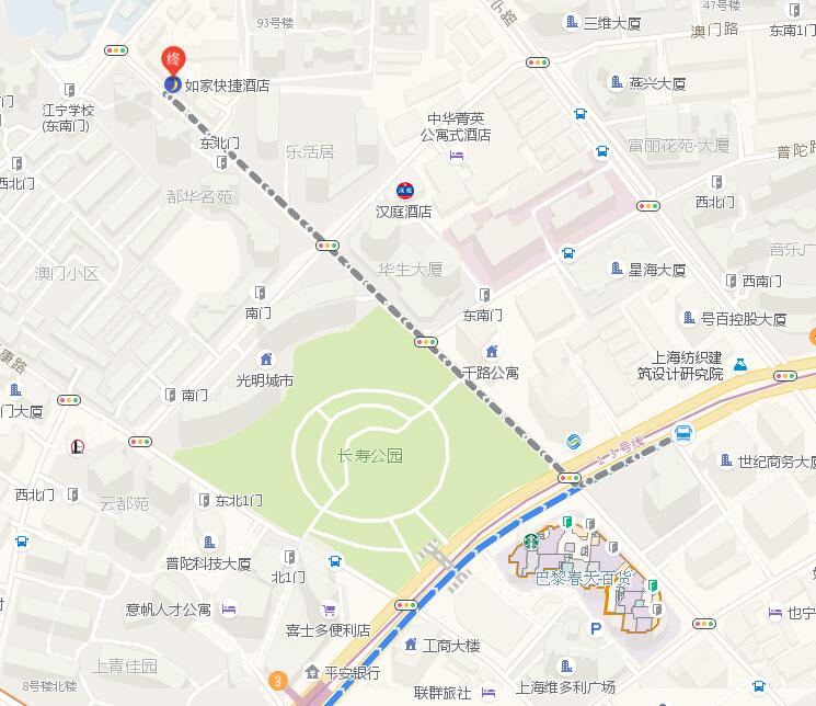 步行 637米 至 终点(约10分钟)如家快捷酒店(上海长寿路陕西北路店),路线详见图片