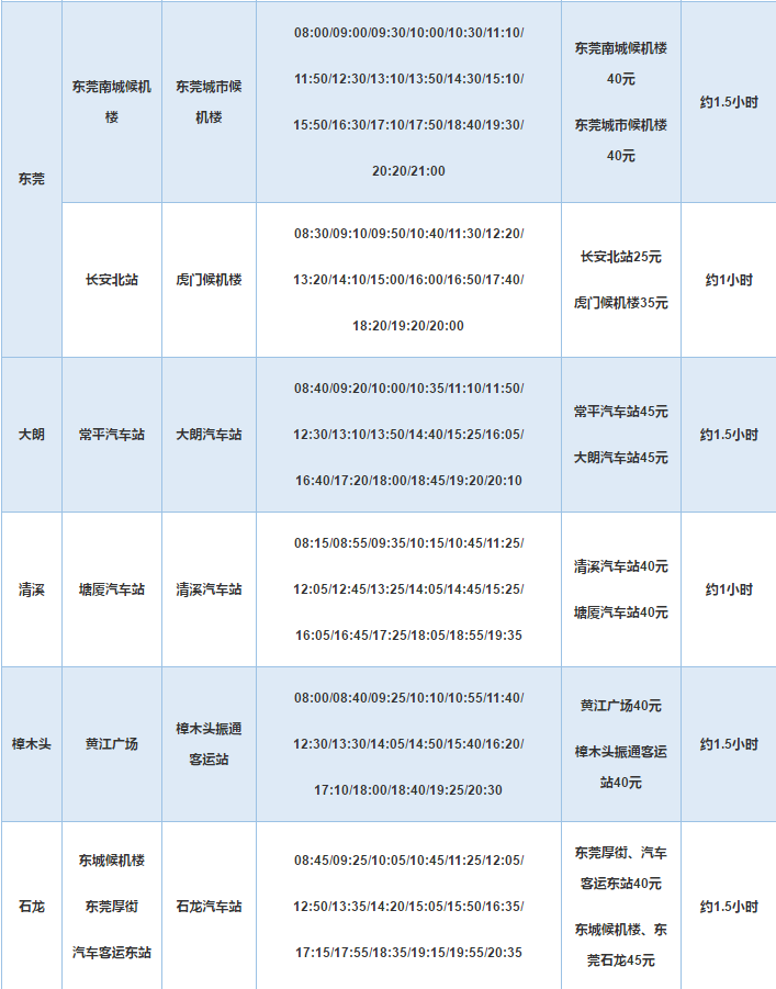 另外有到达东莞大郎候机楼,塘厦常平等。