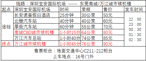 2.晚上21:00地面交通中心柜台C211-212有夜间巴士到达东莞,票价60-90元不等。发车时间:21:00、22:00、23:00、24:00、02:30.