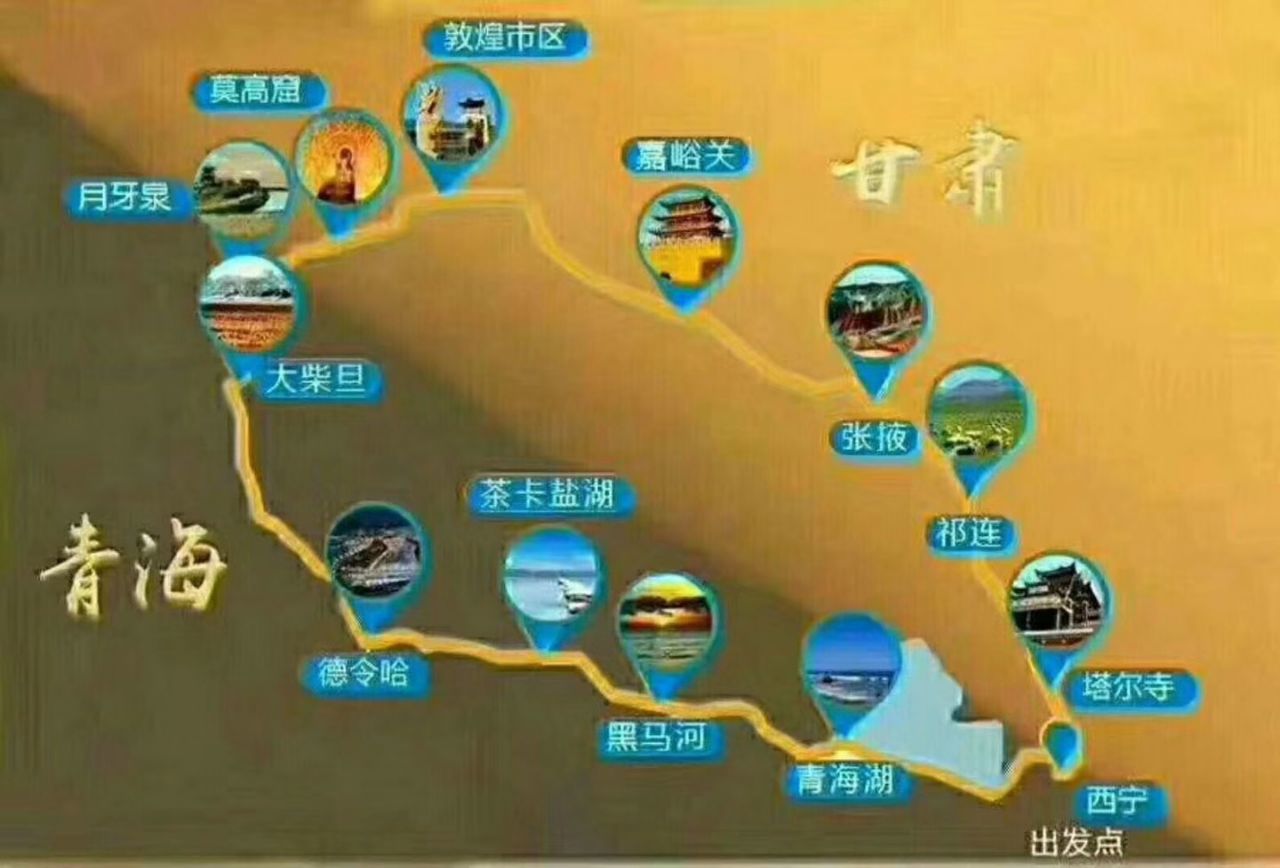 你好 你可以从西宁出发走青海湖 茶卡盐湖 大柴旦 敦煌 嘉峪关 张掖 祁连 西宁 七天大环线 这是一条很成熟的旅游包车线路 这条路线 SUV七天时间 5800