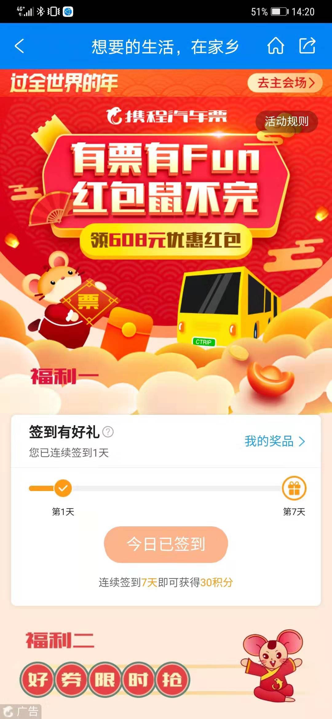 汽车票是没有优惠的,不这现在携程有活动,你可以在汽车页面签到领取代金券,部分车票是可以用的