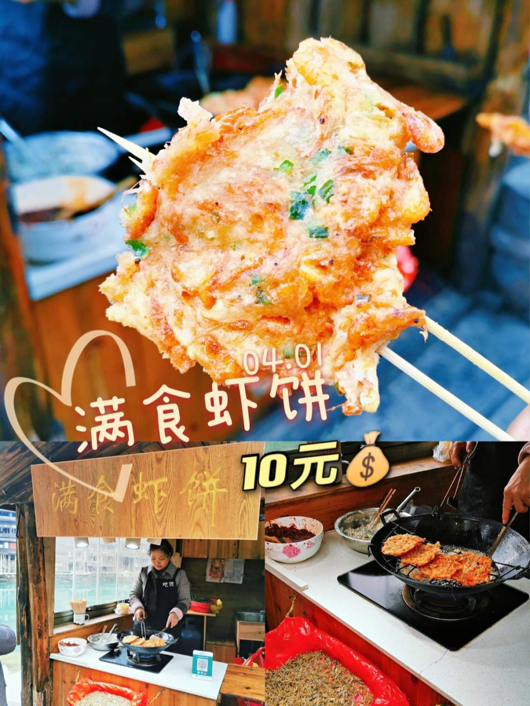 是在江边的一家小摊,位置很好找,10一个,酥酥软软的,很好吃(一个虾饼真的超多虾)