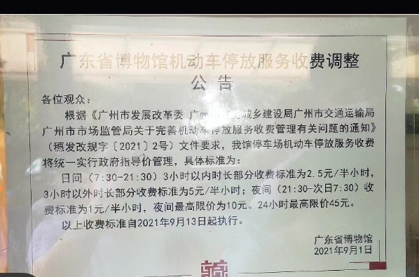 你好!广东省博物馆停车场收费前3小时5元一小时,第四小时开始10元一小时,封顶45元一小时,