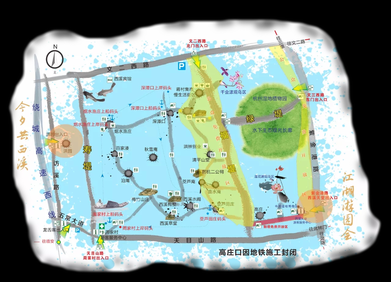 文二西路的北门进入是福堤 要走些路才到河渚街 文三西路的东门进入是绿堤都是免费的 河渚街 西溪且留下就在对面了