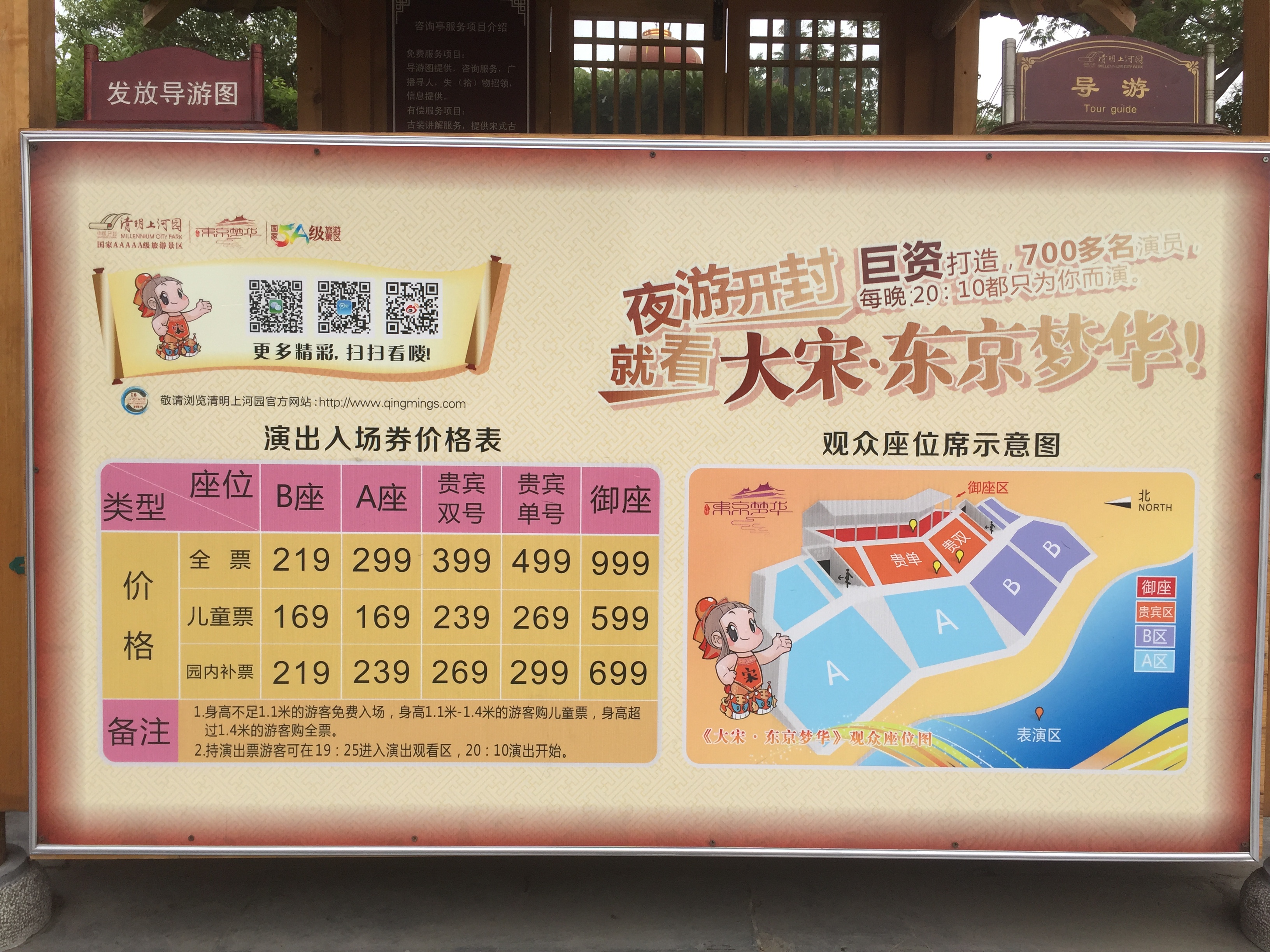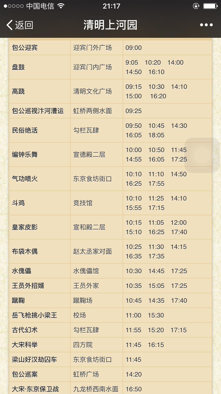 这个是清明上河园节目单,一下午时间足够了,晚上表演是一个多小时,晚上表演九点多结束。大相国寺和开封府都是一个小时左右就足够了