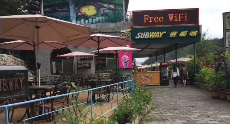 在慕田峪的山脚下,有很多吃饭的地方,有赛百,味馅儿