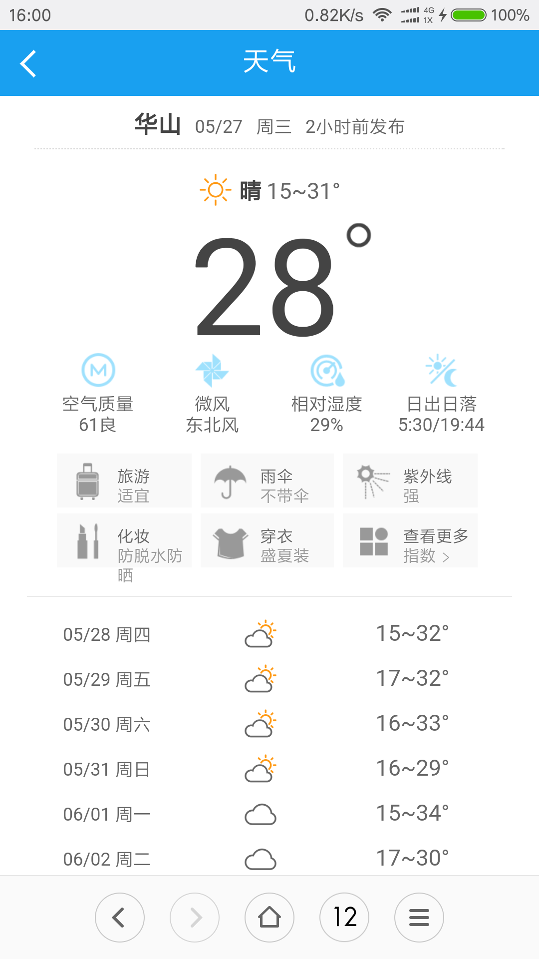 华山脚下温度和西安市区差不多,现在白天温度在25度左右,适宜穿短袖和长裤,最好加一件防晒衣。山顶温度相对低一些,晴天约在20度左右。
