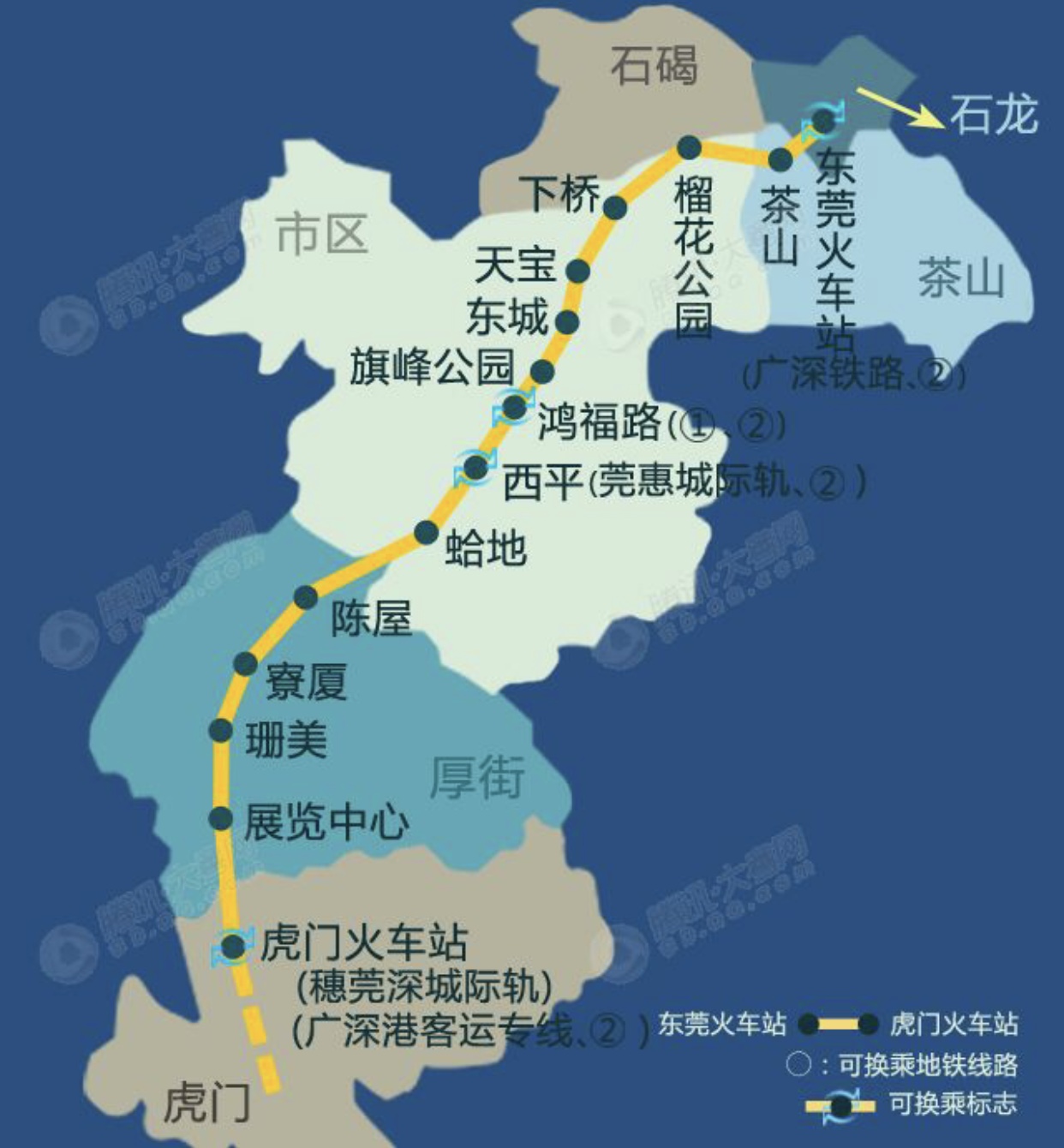 东莞地铁2号线是至今东莞唯一开通的一条地铁线,这条地铁线连接的是两个重要车站、东莞的市中心和厚街镇市中心。其中石龙站又名东莞站,现在主要是到广州、深圳的动车;虎门火车站是高铁站。