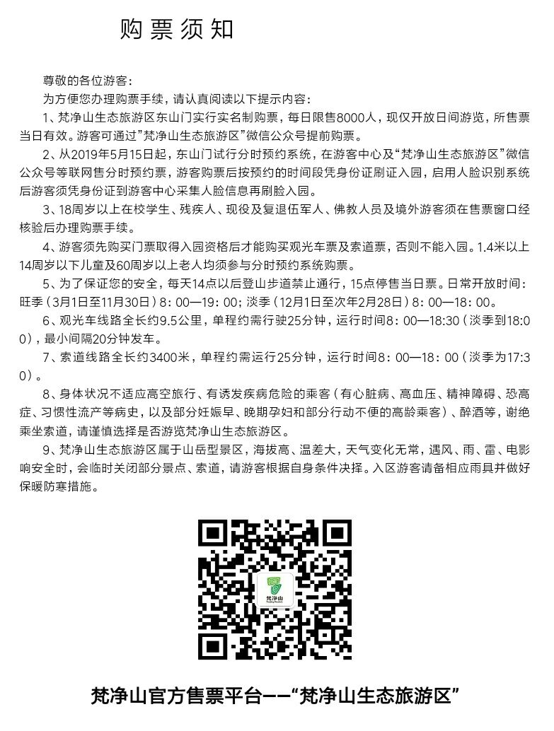 1、梵净山生态旅游区东山门实行实名制购票,每日限售8000人,现仅开放日间游览,所售票当日有效。