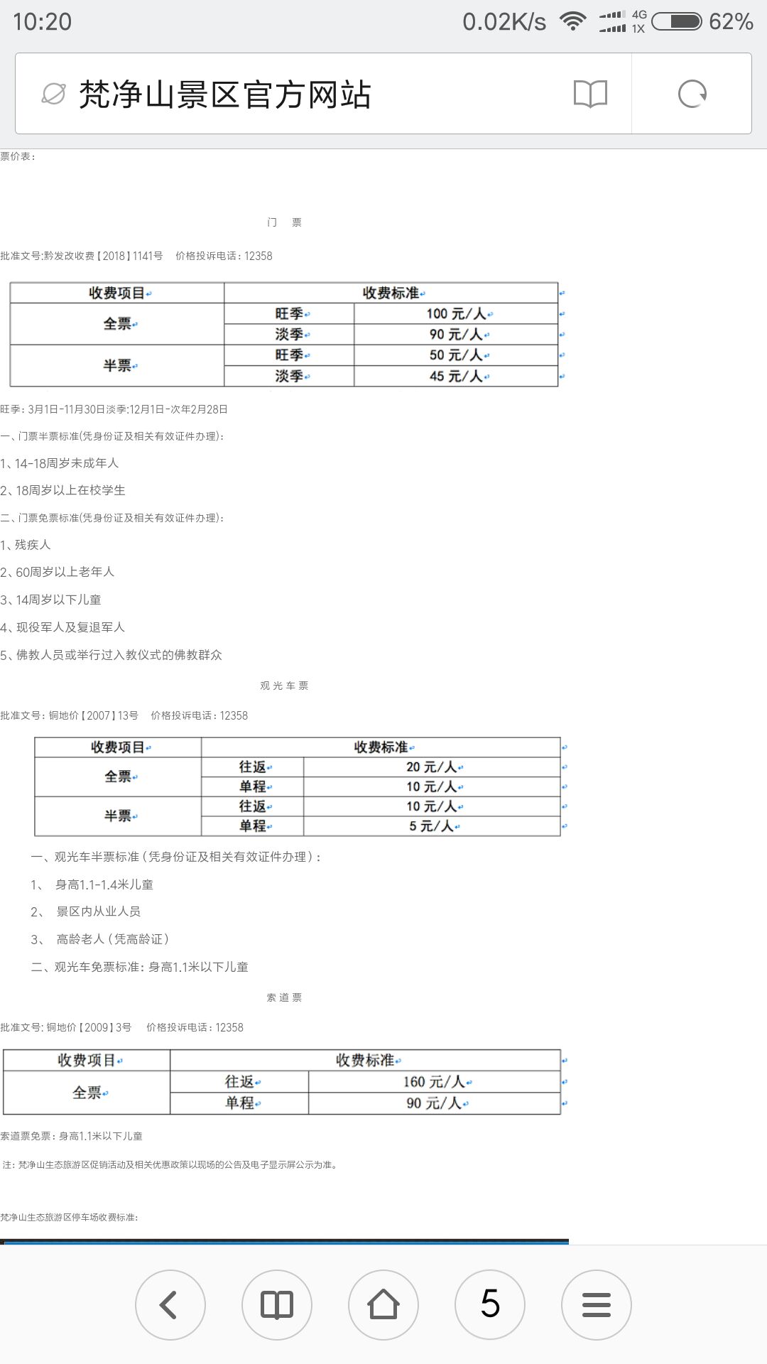 观光车全票往返票价20元,单程10元;半票往返票价10元,单程5元