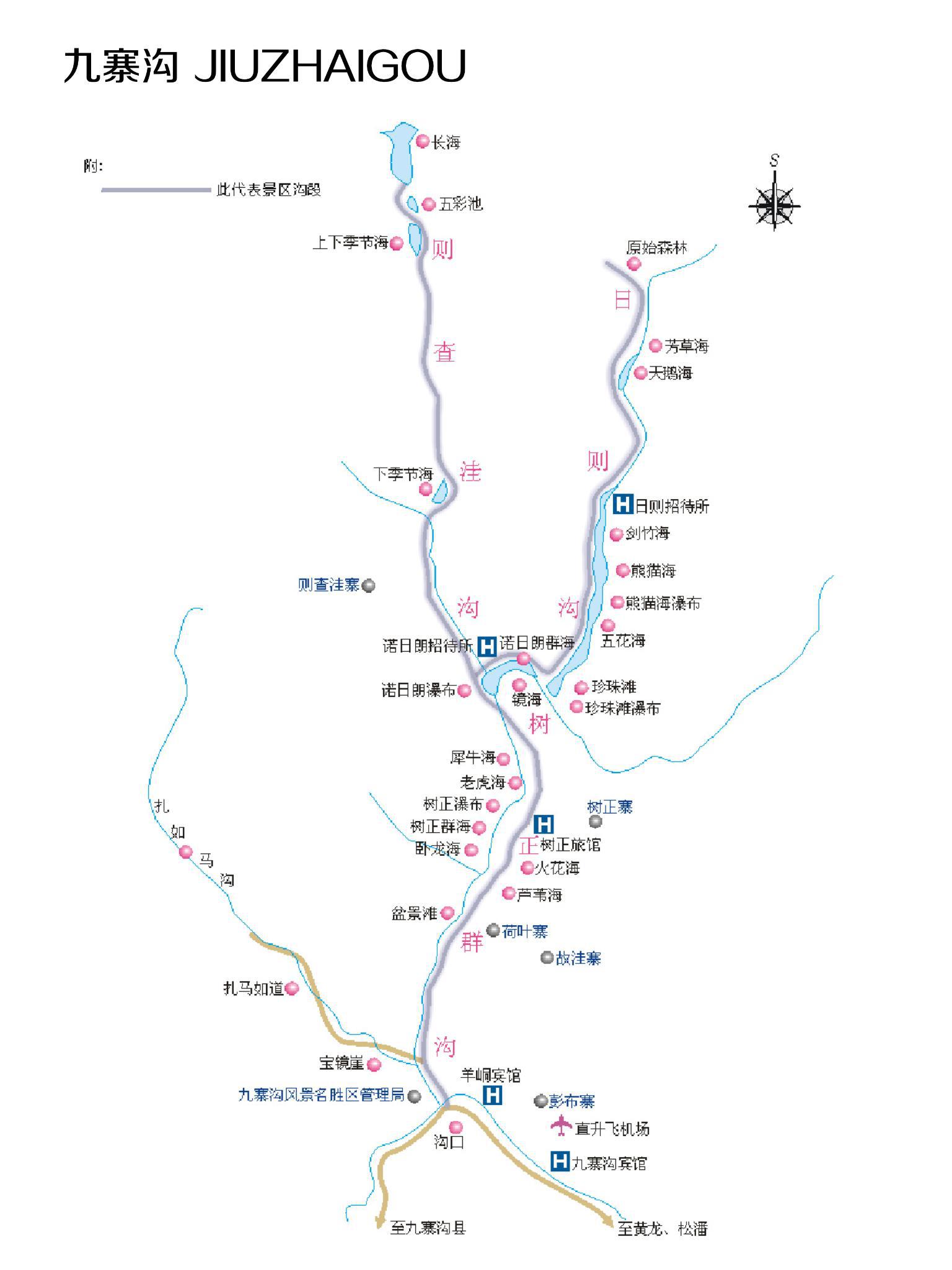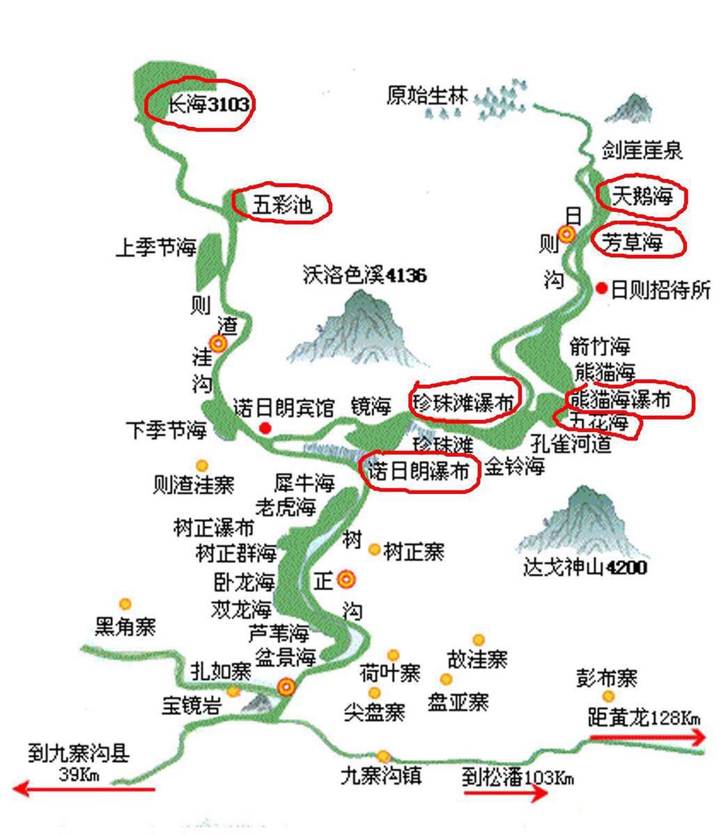 日则沟(镜海--珍珠滩--五花海--熊猫海--箭竹海)--诺日朗中心--则渣沟(五花海--长海)--诺日朗中心--树正沟(犀牛海--老虎海--树正群海--芦苇海--盆景滩)