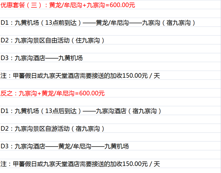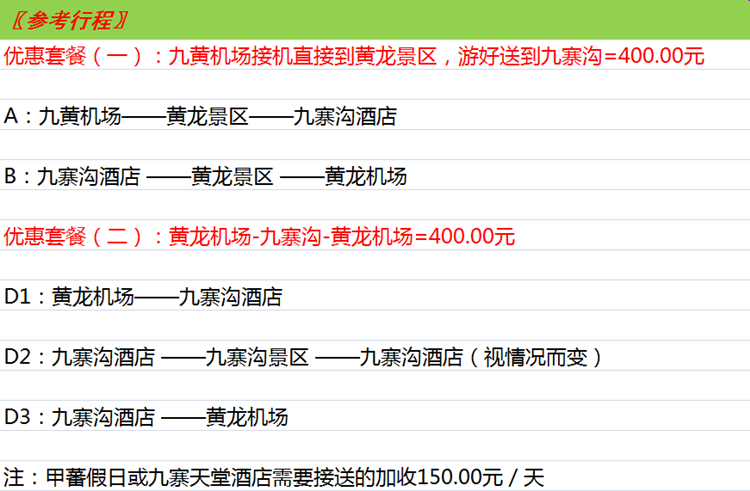 您好,具体费用要看您的具体行程安排了!当然最基本的如果是中午的飞机到黄龙机场行程就可以这样安排 第一天 九黄机场接机玩黄龙,玩了黄龙以后住宿九寨沟(上午的航班到) 第二天玩九寨沟 第三天九寨沟-九黄机场,这样包车费用正规出租车一共600元