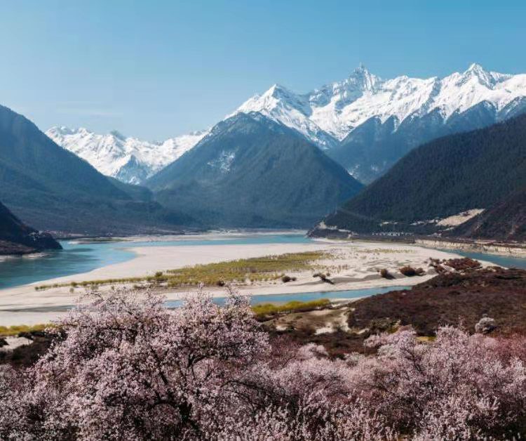 林芝桃花主要分布在318国道沿途、波密、然乌湖、尼洋河风光带、机场至八一镇沿线、拉林高速林芝段以及林芝山南方向靠近林芝段,雪山之下,与云朵相拥,形成密集的桃林。