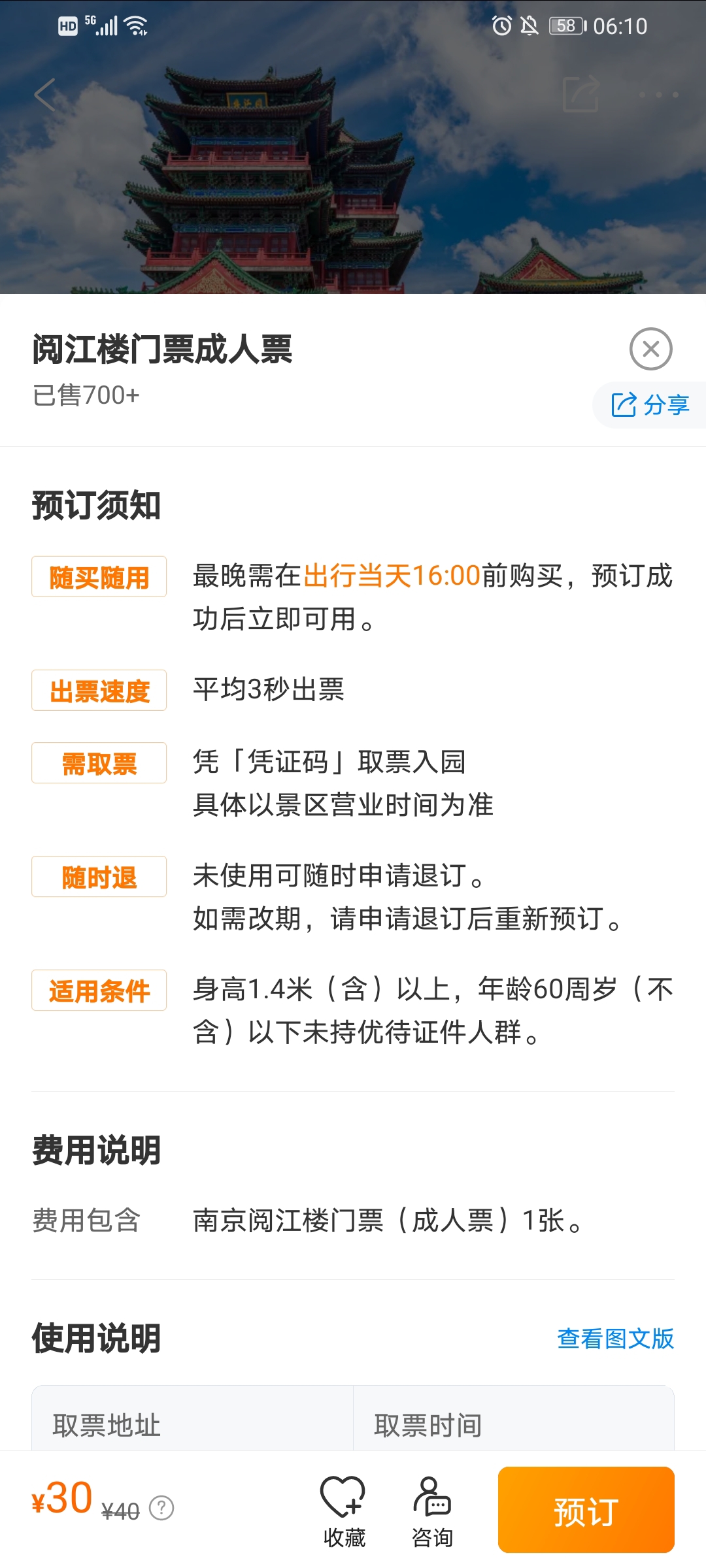 游览阅江楼,在携程APP购票后,需要在景区售票处凭二维码取票入园,可以取纪念票。