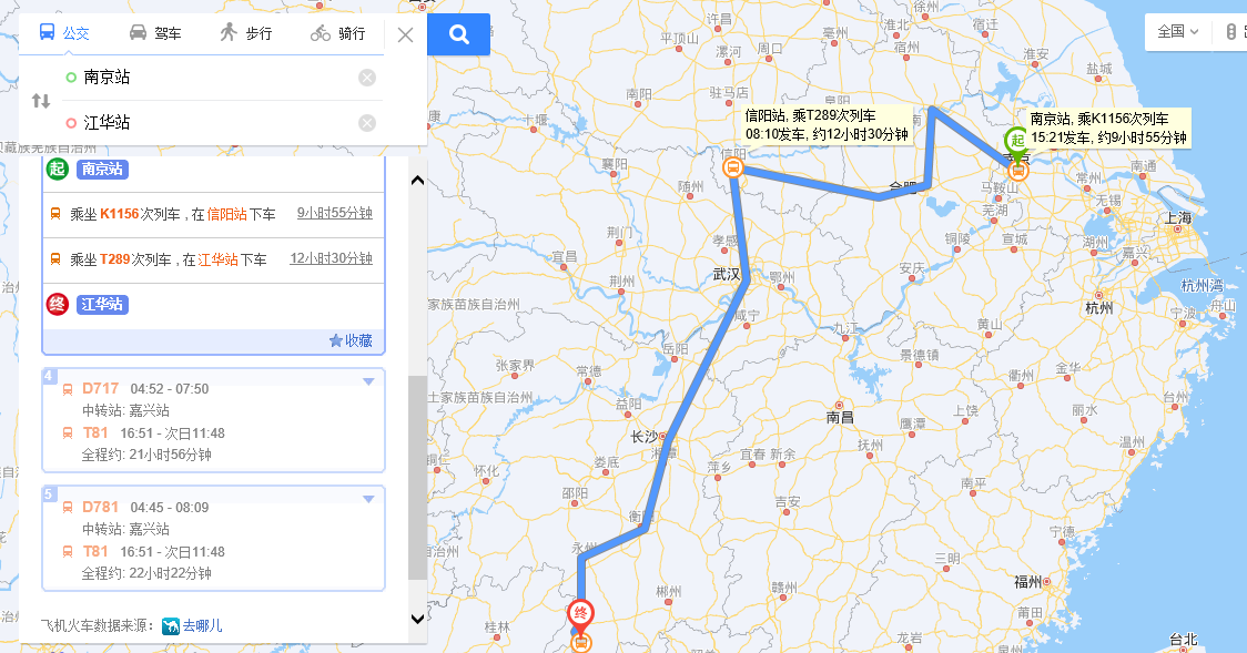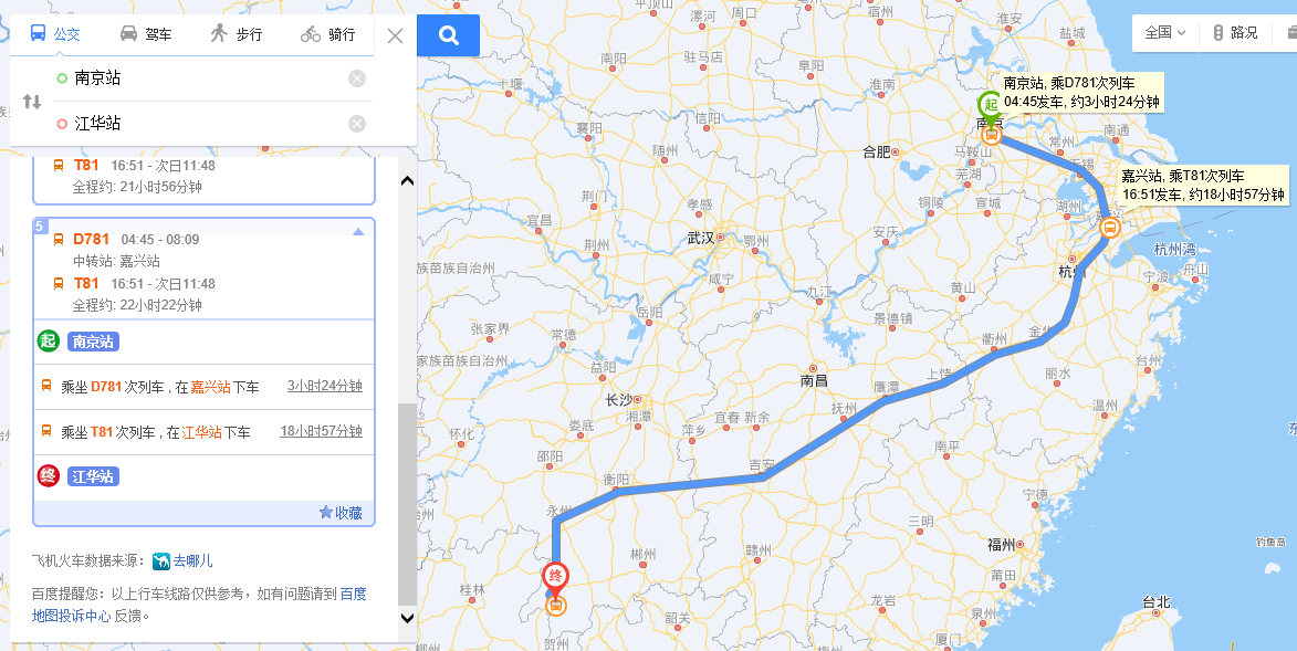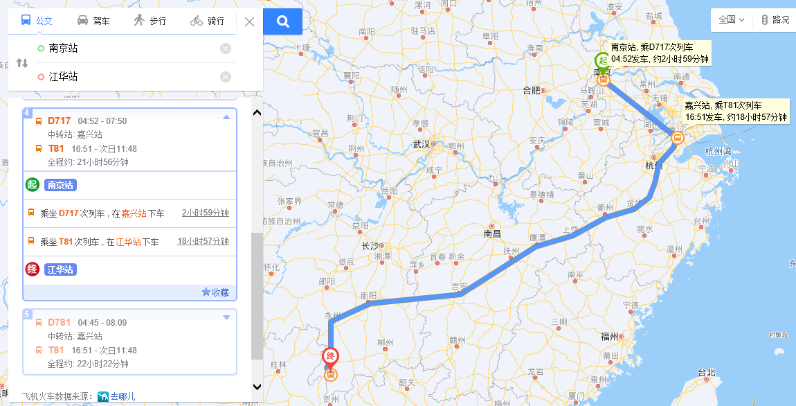 5、乘坐D781从南京站出发到嘉兴站转乘T81路可到达江华市。
