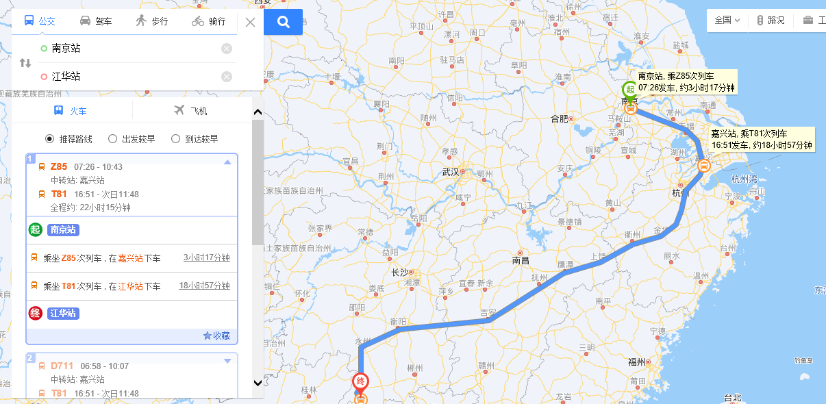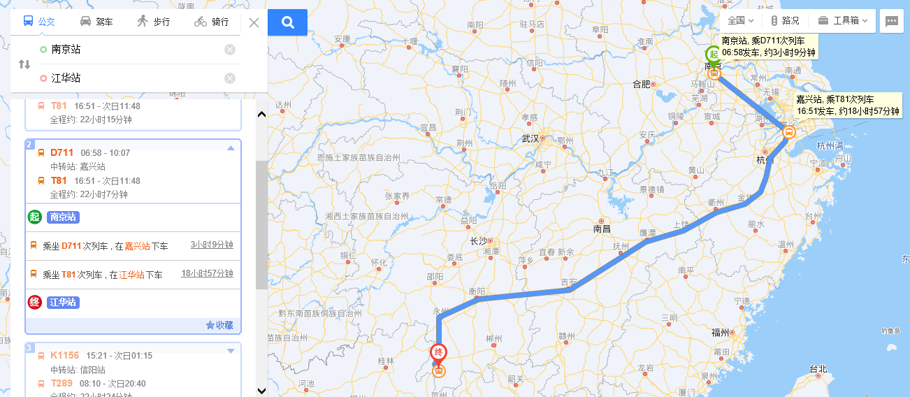 2、乘坐D711从南京站出发到嘉兴站转乘T81可到达江华市;