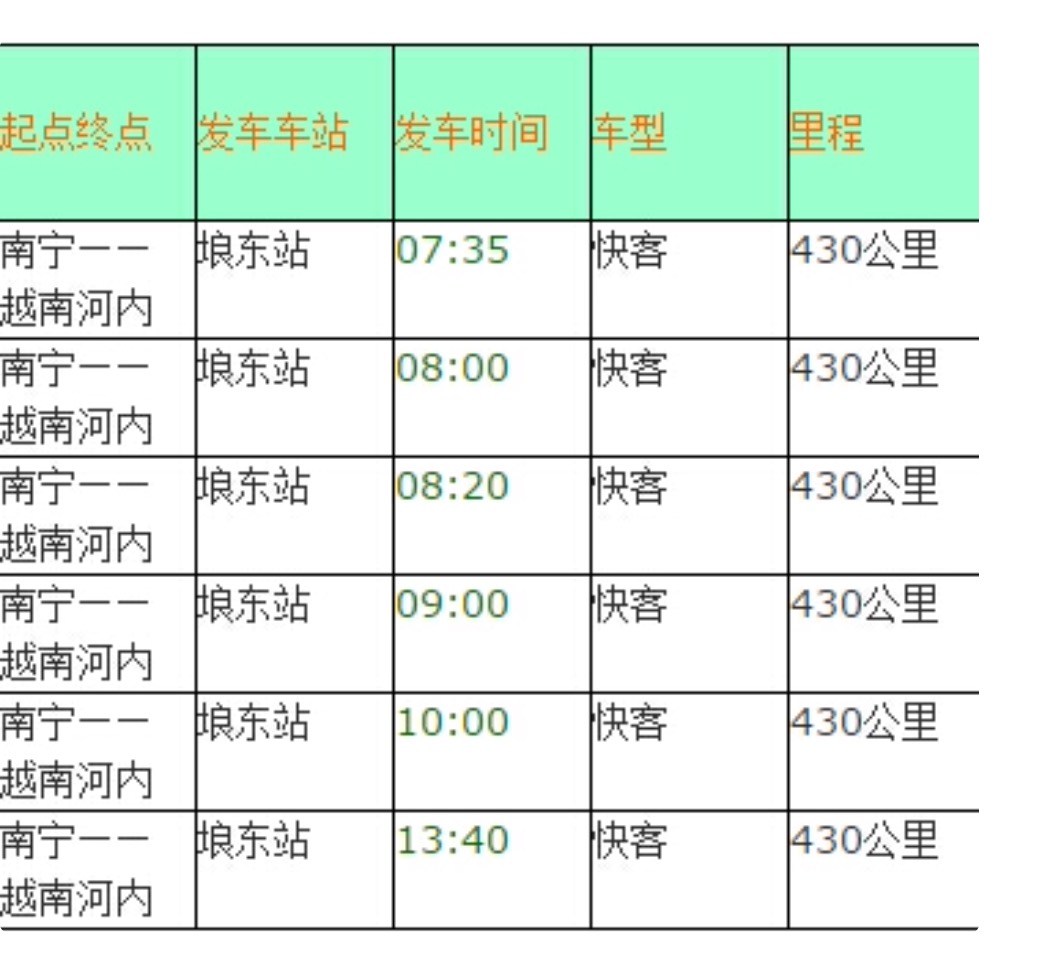 1 :火车。每天有从南宁发往越南河内的火车。发车时间为中国时间18:30分。(硬卧)第二天早上7:00左右到河内。