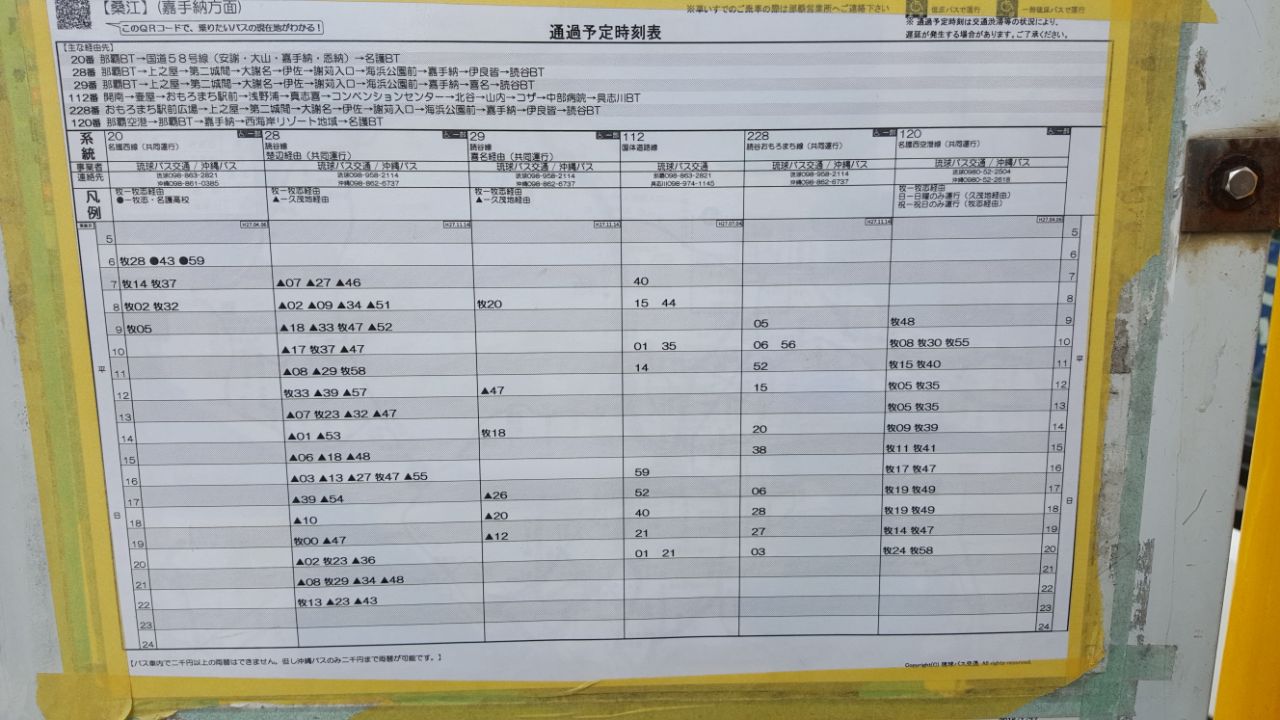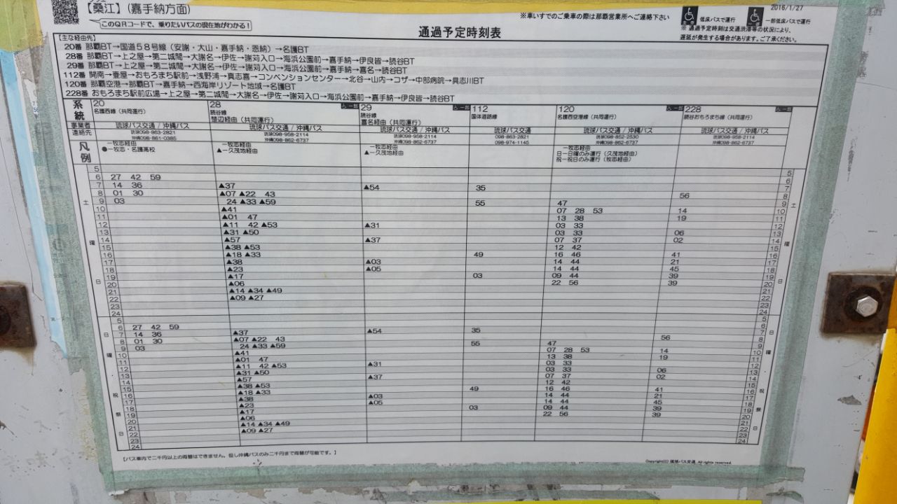 冲绳大部分公交车都是根据距离收费的,上车拿一张纸片,上面有号码,下车对照电子屏幕的号码付钱,机器都有自动换零钱的机器,切记是换零钱的机器,而不是我们传统观念的找零机,换了零钱边上继续投币哦。只有坐到过一次,在那霸市区,统一票价的车子,成人230、孩子130,仅此一次,几路忘记了。