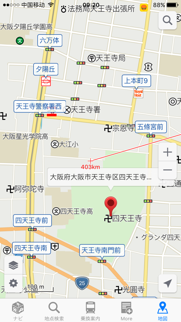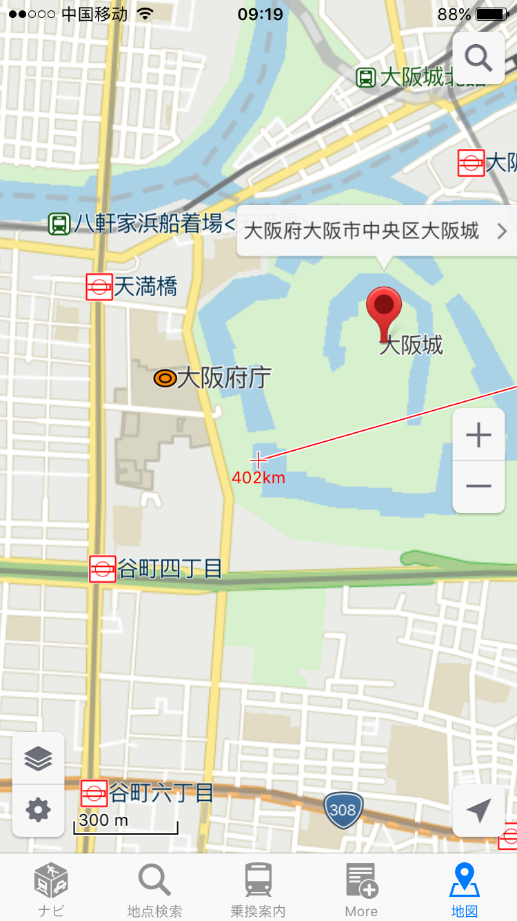 如图所示,从大阪城天守阁出来后,往西南方向移动到达路口的谷町四丁目地铁站,坐地铁谷町线三站路到达四天王寺前夕阳之丘站,往东南方向走一会就到四天王寺了。周游券景点和地铁都是免费的。