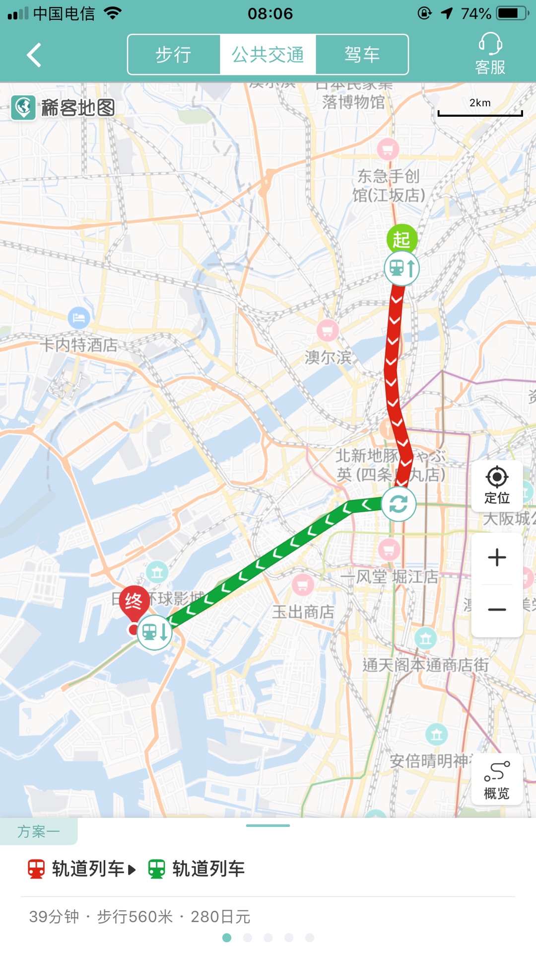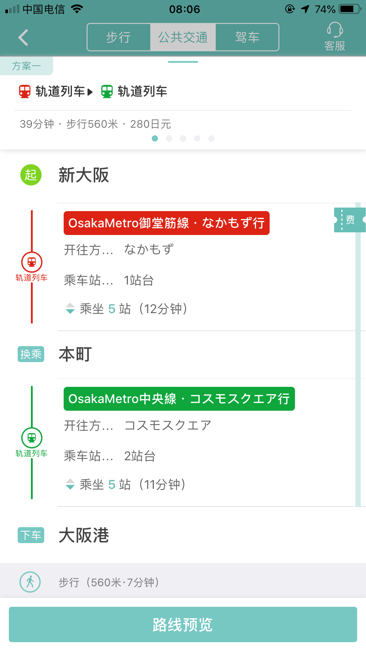 2.在新大阪站,乘坐地铁御堂筋线到 本町站,转乘地铁中央线到 大阪港站,出站步行5分钟即到。