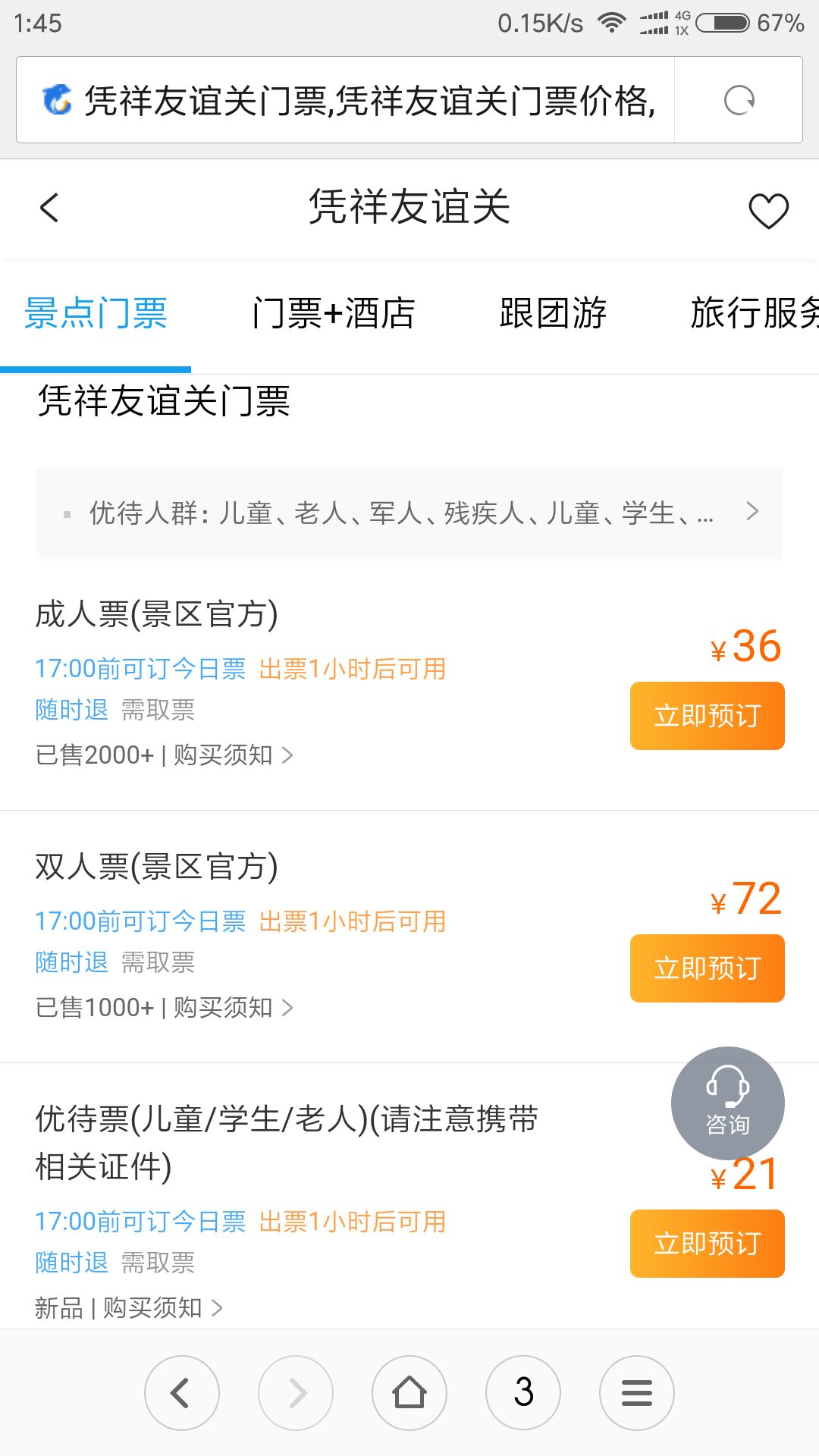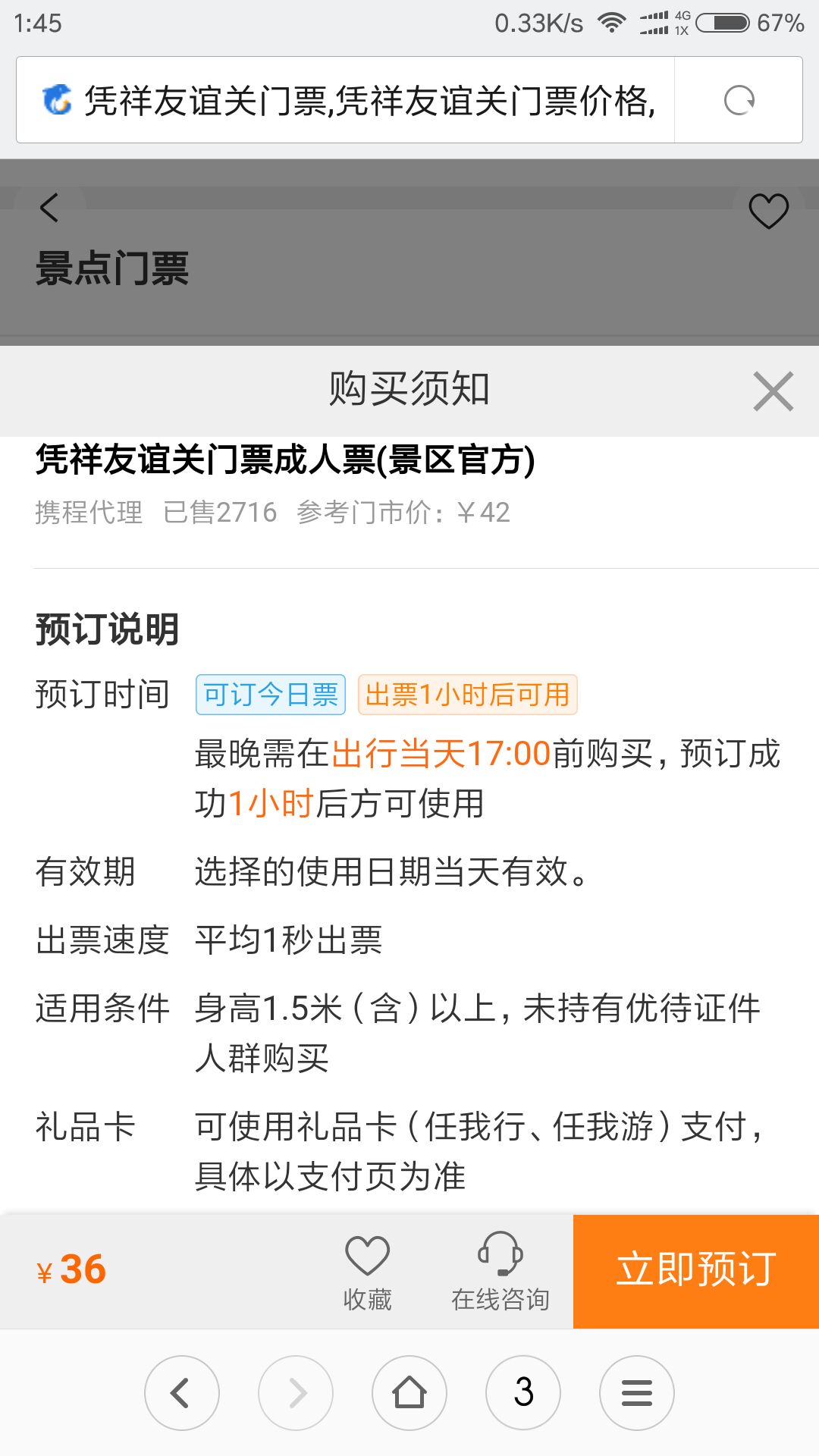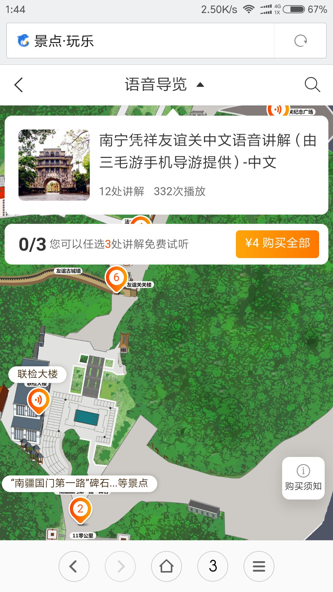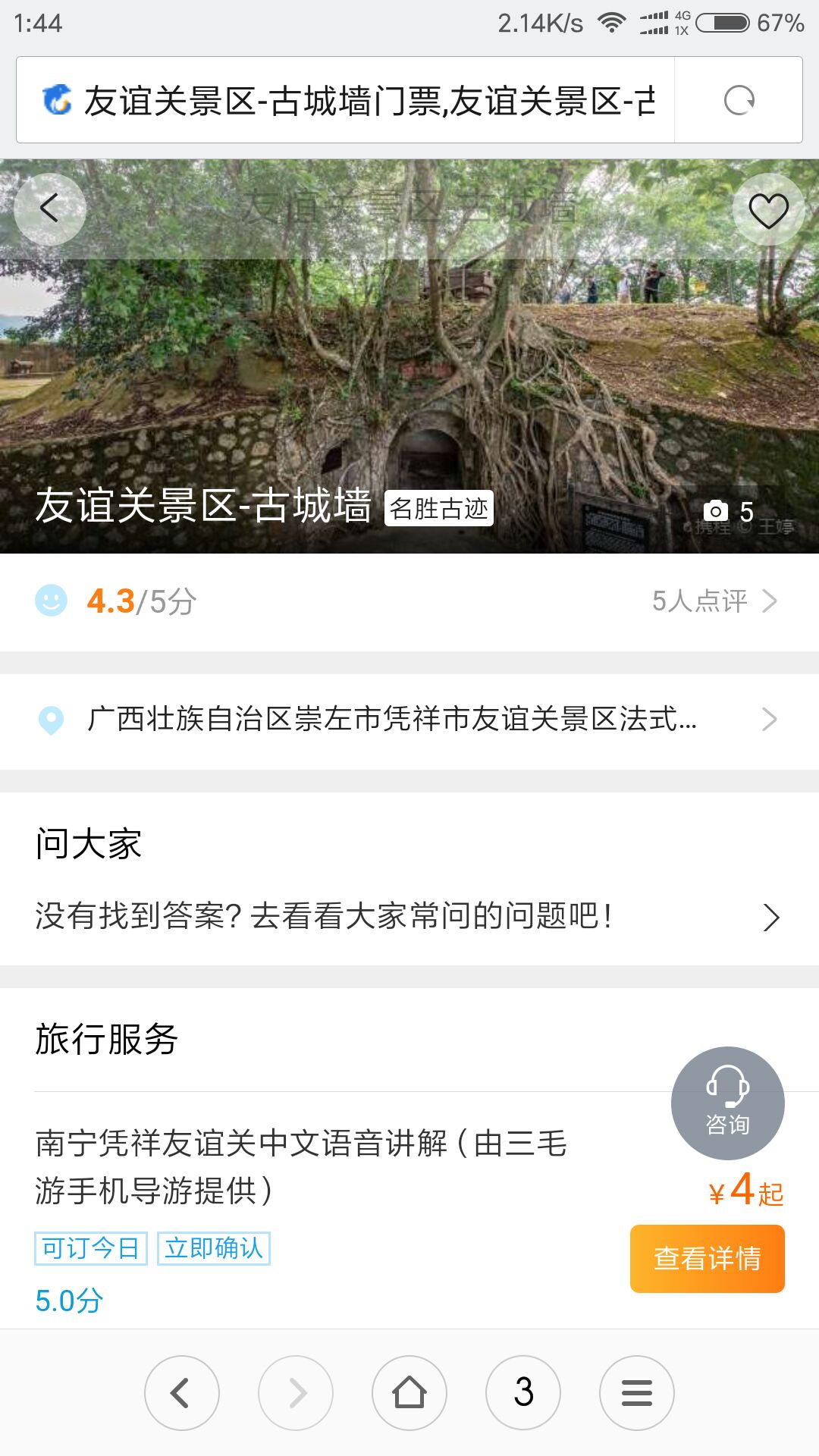 凭祥友谊关门市成人票42元,在线购票36元。4元是购买手机下载的中文语音讲解……