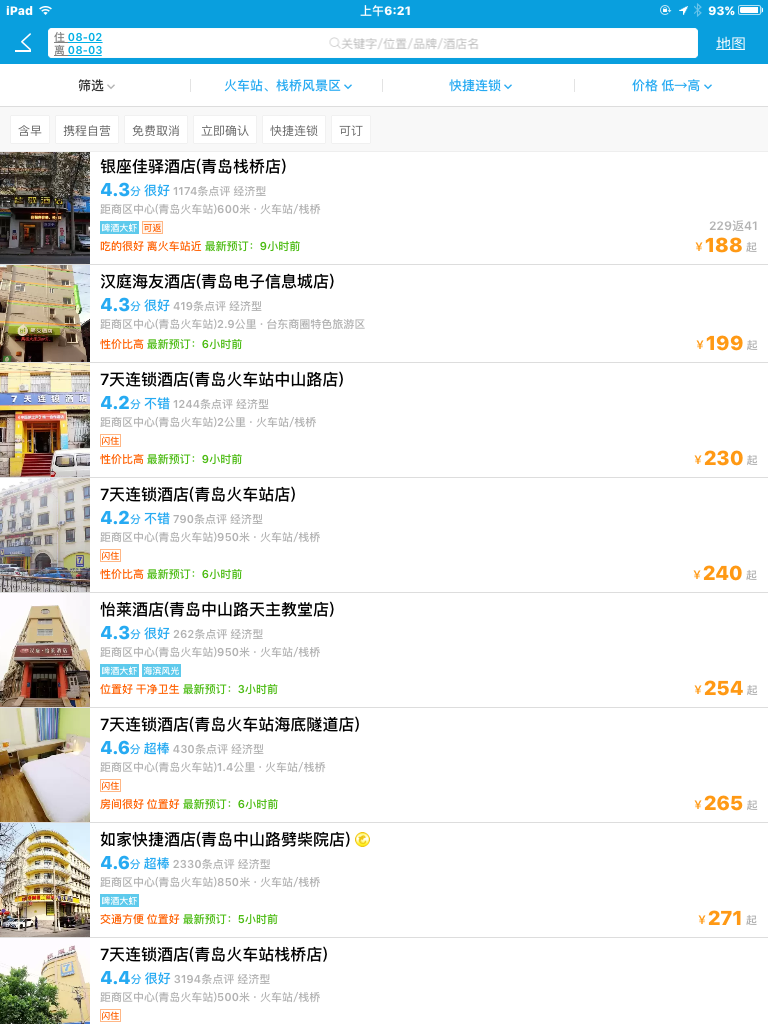 助你为乐!建议提早在携程旅行网预订酒店,青岛是一个休闲度假的旅游城市,火车站附近是栈桥风景区,而且出行公交线路四通八达,所以订酒店可选择火车站附近的连锁酒店,性价比高且酒店管理规范,当然如果个人预算高,也可选择该区域四星以上的酒店,总之,丰俭由人! 第一天:栈桥 > 第一海水浴场 > 八大关 > 第三海水浴场 > 五四广场