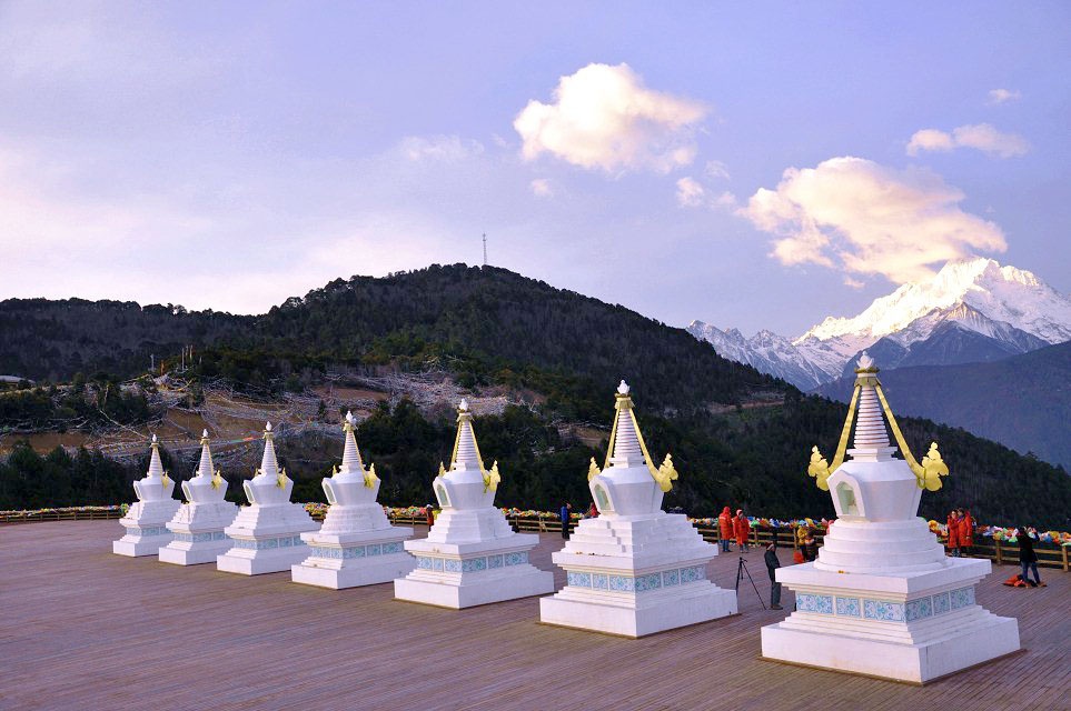飞来寺位于距离德钦县城约10公里处的滇藏公路边,正对梅里雪山主峰卡瓦格博。距今已有380余年。事实上飞来寺本身是个很小的寺庙,平时只有一个喇嘛和一只猫还有一只大公鸡为伴。寺里有“中日梅里雪山登山勇士殉难”纪念碑和一座佛塔,纪念碑是为纪念1991年1月4日梅里雪山登山队的17名遇难登山队员而立,佛塔则是为了纪念十世班禅视察德钦所建。看梅里雪山“日照金山”的地点,飞来寺村里有比较舒适的酒店,也有适合背包客的青年旅舍,适合不同类型的旅行者。大家可以在各家客栈看日照金山,各家客栈阳台看是不用钱的。也可以去飞来寺的观景台看日照金山 ,那是要门票的。“日照金山”并不是每天都能看到,要看个人的运气,日照金山大概也就能维持30分钟左右,所以大家一定要抓紧时间欣赏、拍照,时间大概是8点左右。【开放时间】8:00-17:00