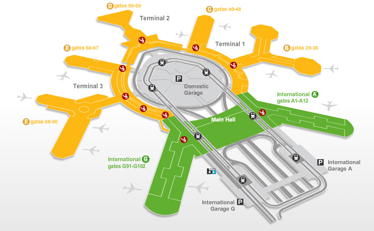 登机厅3:由登机区E和登机区F所组成的第三航站楼之前的名称是北航站楼(North Terminal)。第三航站楼为联合航空的国内航班。 旅客可以透过步道往来第三航站楼与国际航站楼G登机区,无需再次通过安检。