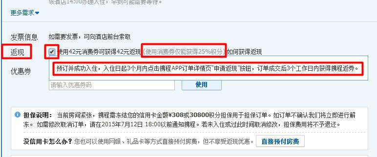 参见附图,目前的政策是,你选择有返现的房型,在预订界面下面,有返现的复选框。在有消费券的情况下勾选(现在都不知道在哪里查看消费券,可能已经取消展示了,反正一般都足够,不够应该不让你勾选),鼠标移至“如何获得返现”区域,会告诉你预订并成功入住,在入住日起3个月内点击携程APP订单详情页”申请返现“按钮,订单成交后3个工作日内获得携程返券。
