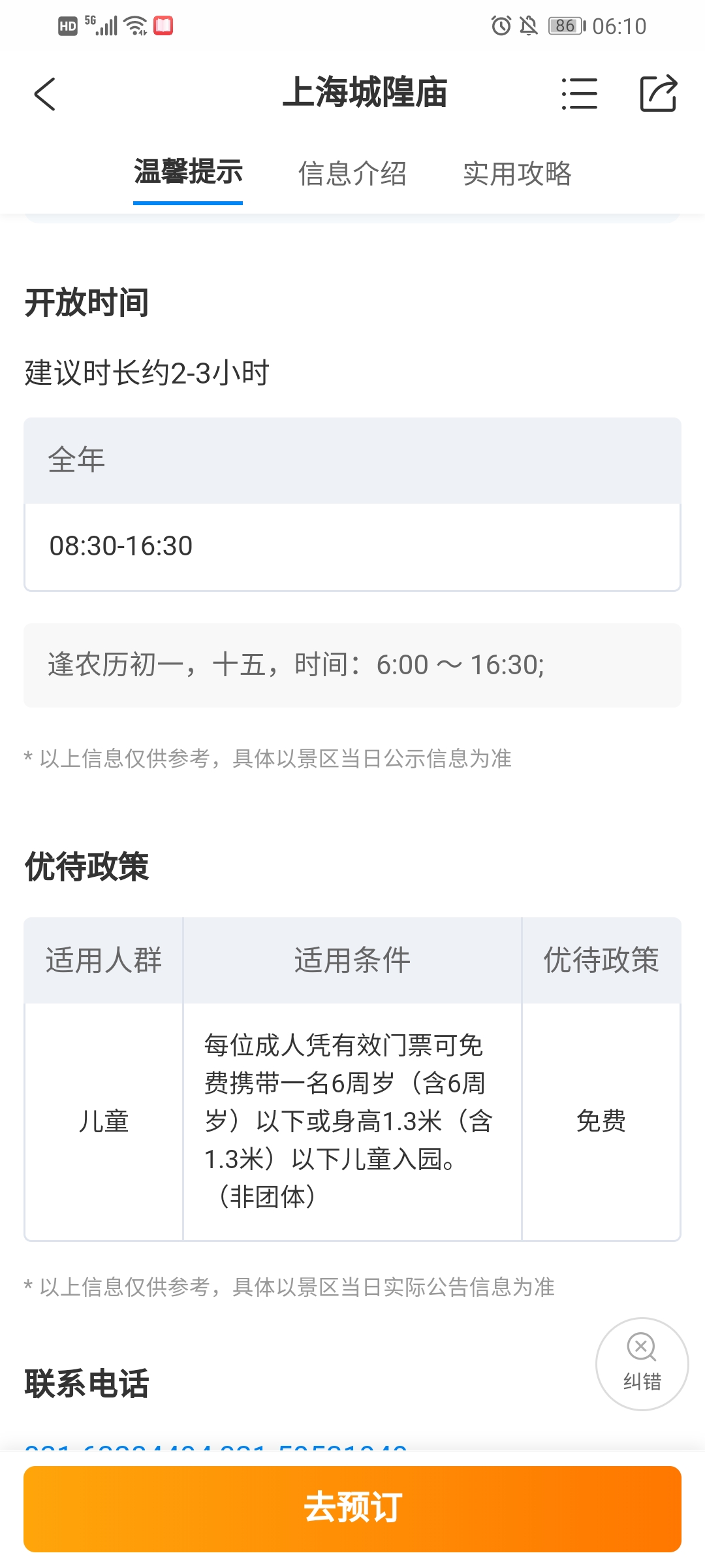 风景区全天开放,夜景非常美丽;城隍庙8:30~16:30开放。