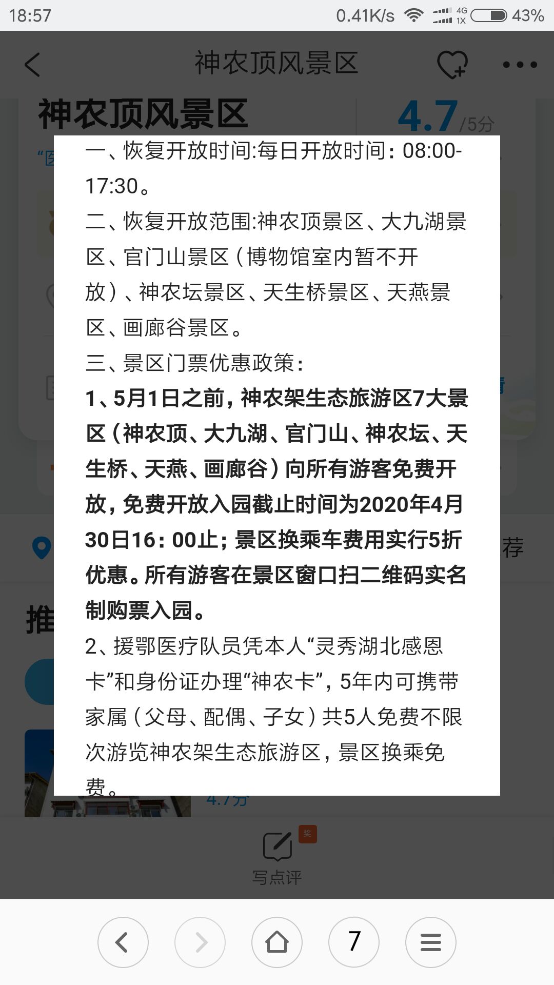 5月1日之前,神农架生态旅游区7大景区(神农顶、大九湖、官门山、神农坛、天生桥、天燕、画廊谷)向所有游客免费开放,免费开放入园截止时间为2020年4月30日16:00止;景区换乘车费用实行5折优惠。所有游客在景区窗口扫二维码实名制购票入园。