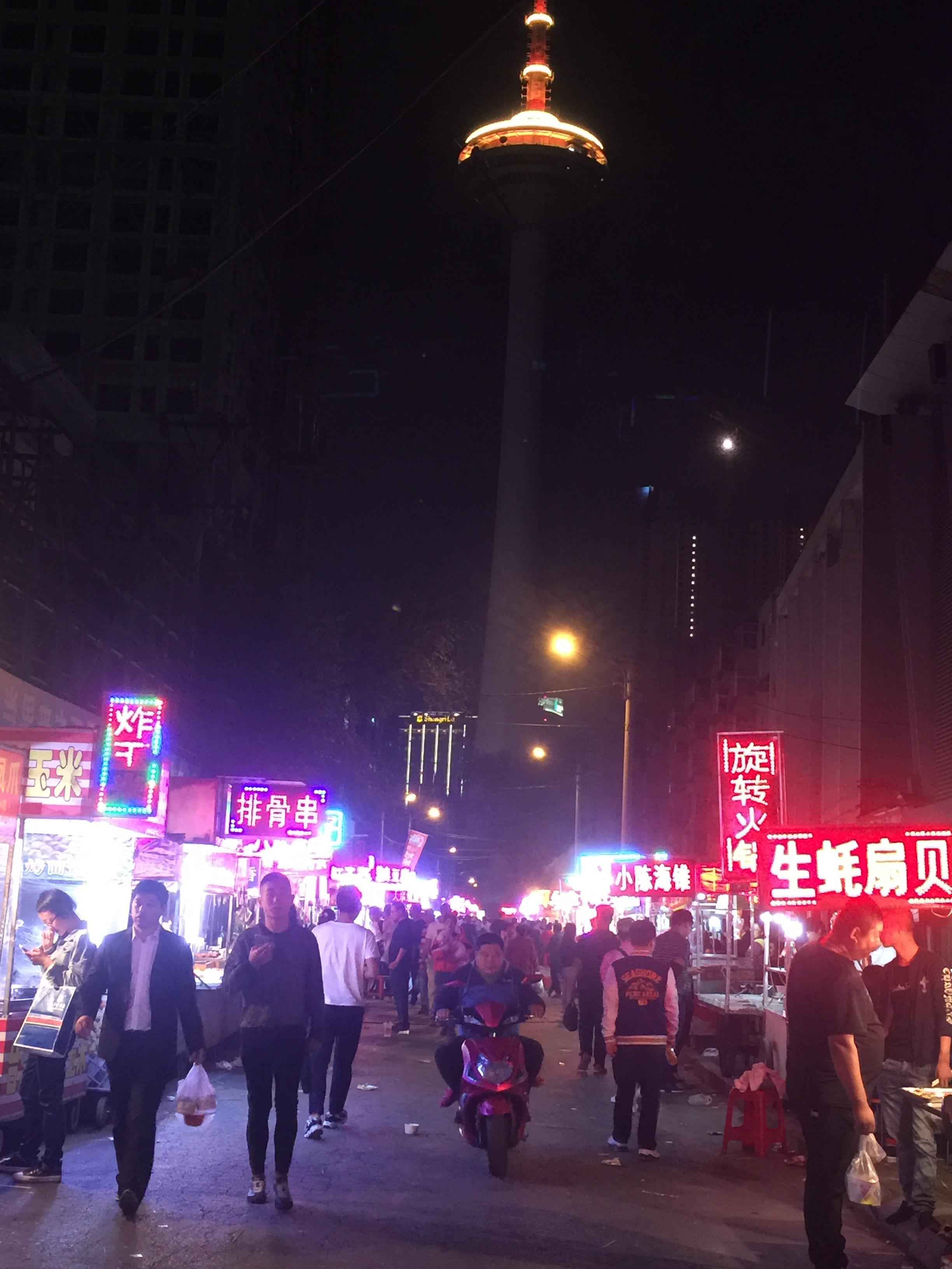 下图是晚上在彩塔夜市用手机拍的,画质差些,后面高的就是彩电塔。