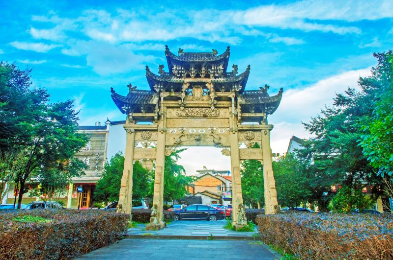 4、詹宝兄弟进士牌坊是为弘治丙辰科进士詹宝而立。詹宝兄弟进士坊呈东西走向,系仿木石结构,全部用青石雕刻砌筑,四柱三间五楼,歇山顶,通面阔6.35米,明间阔3.45米,次间阔1.45米,坊高8.5米。