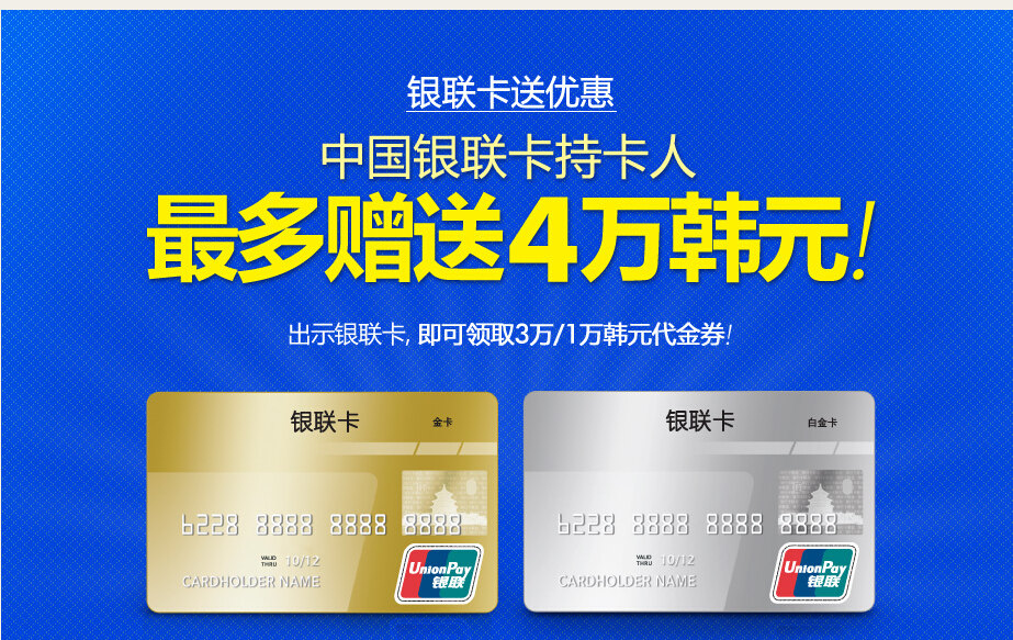 现场刷银联卡可以打95折。银联信用卡在韩国境内所有商户让您畅“刷”无阻,银联借记卡可以在包括各大免税店、百货店、品牌折扣店、超市便利店在内的三十余万家商户使用;遍布商场、地铁、大学等各处的4万多台具有银联标识的ATM,能让您方便地提取韩元。更棒的是,刷银联卡走银联网络可以降低汇率损失,减少取现手续费,还可享受众多商家的优惠