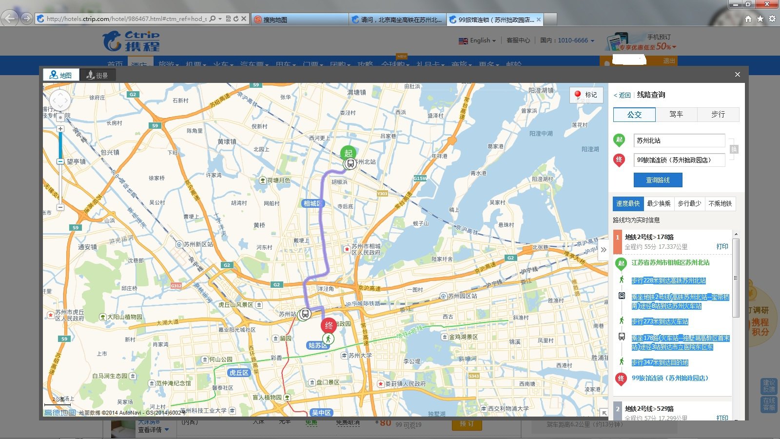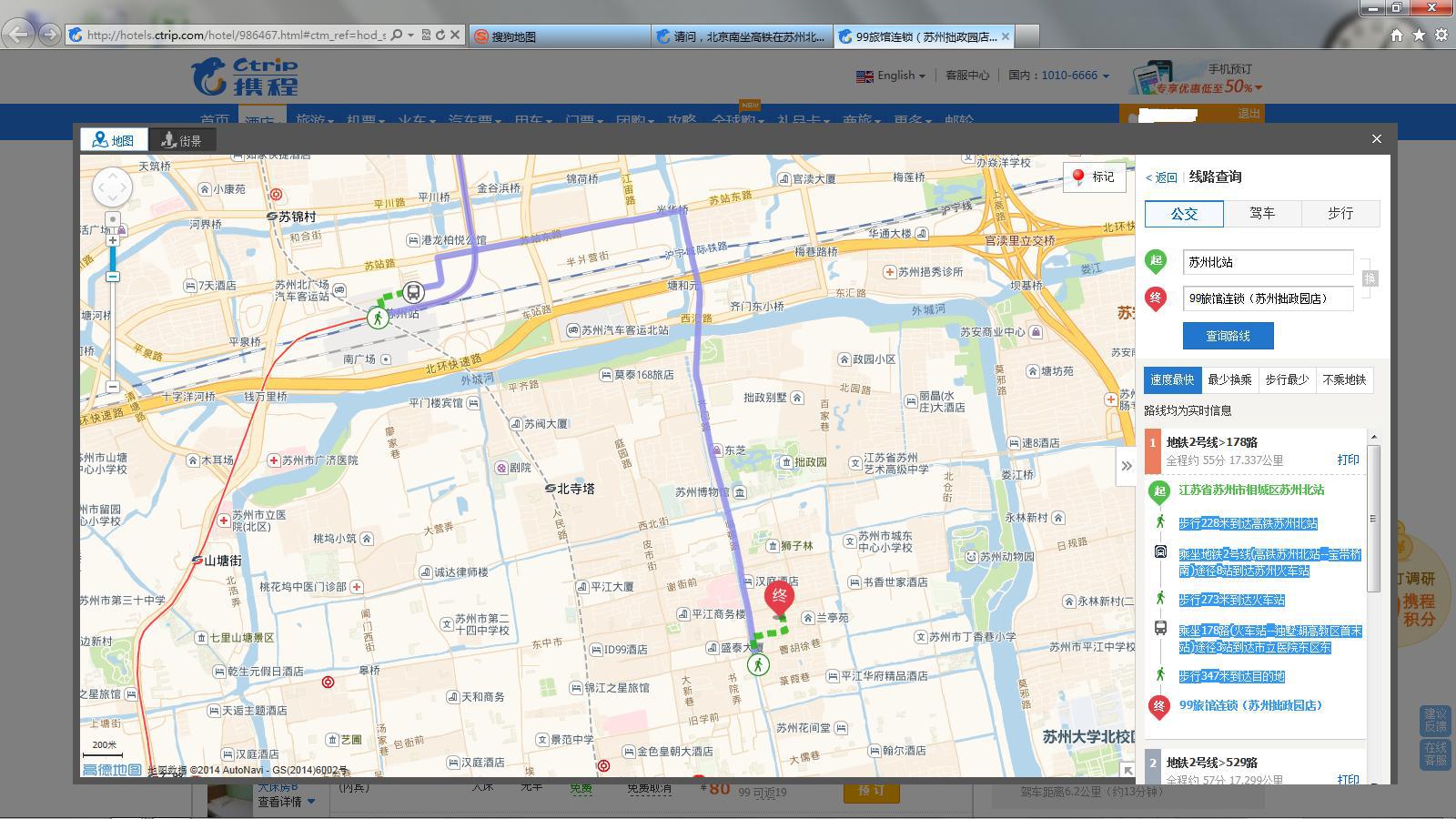 1、出了苏州北站后,步行228米到达高铁苏州北站,乘坐地铁2号线(高铁苏州北站--宝带桥南)途径8站到达苏州火车站,步行273米到达火车站汽车站,乘坐178路(火车站--独墅湖高教区首末站)途径3站到达市立医院东区东,步行347米到达目的地---99旅馆连锁(苏州拙政园店)---大致路线有附图。
