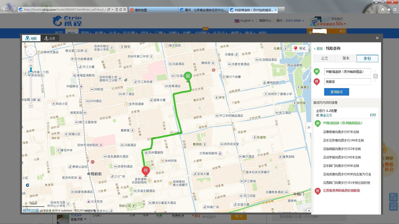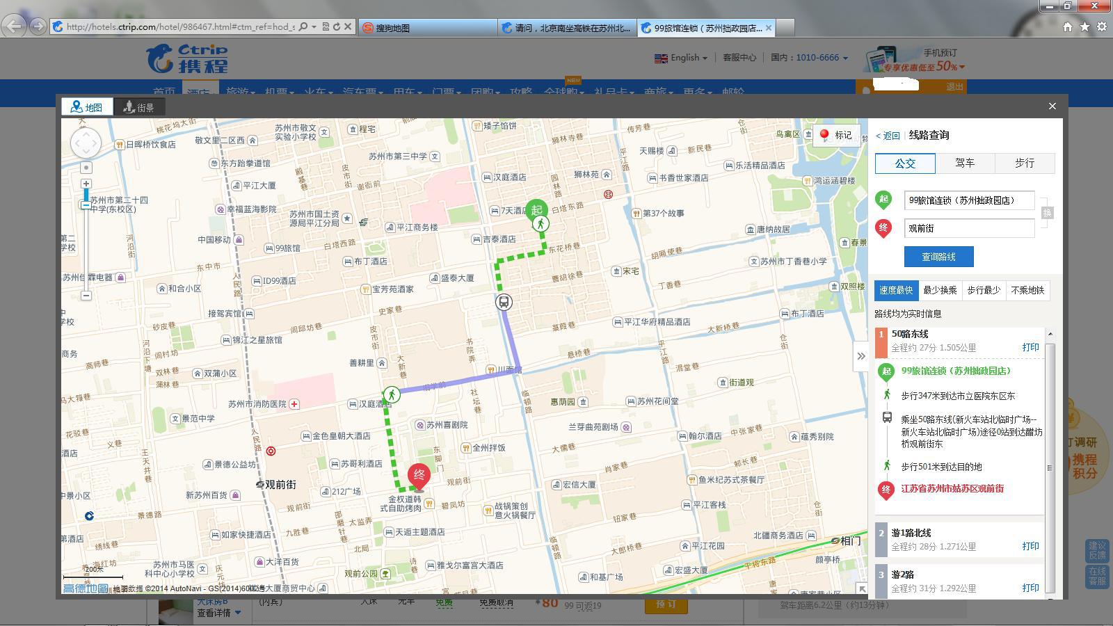 从99旅馆连锁(苏州拙政园店)步行347米到达市立医院东区东,乘坐50路东线(新火车站北临时广场--新火车站北临时广场)途径0站到达醋坊桥观前街东,步行501米到达目的地---观前街如果步行一般需要25-35分钟。坐车步行均可。另外去观前街还有其他方式,见附图。