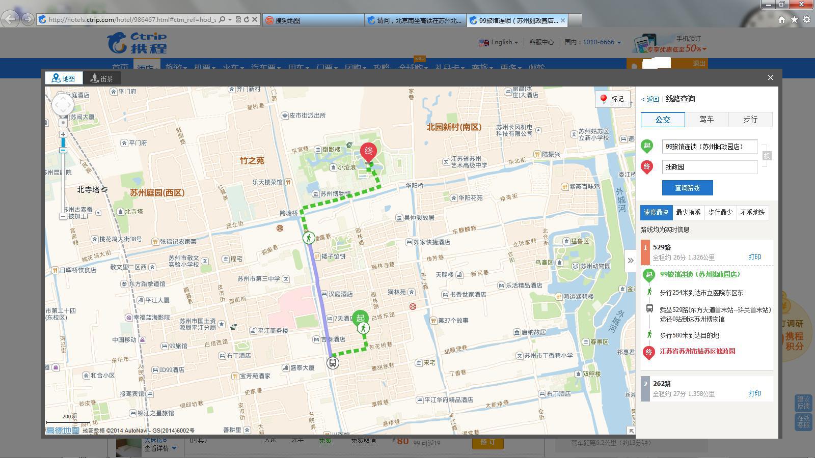 2、从99旅馆连锁(苏州拙政园店)去拙政园:步行254米到达市立医院东区东,乘坐529路(东方大道首末站--浒关首末站)途径0站到达苏州博物馆,步行580米到达目的地---拙政园,这一站地你自己步行也是可以的。也就20分钟左右,建议步行。(有附图)