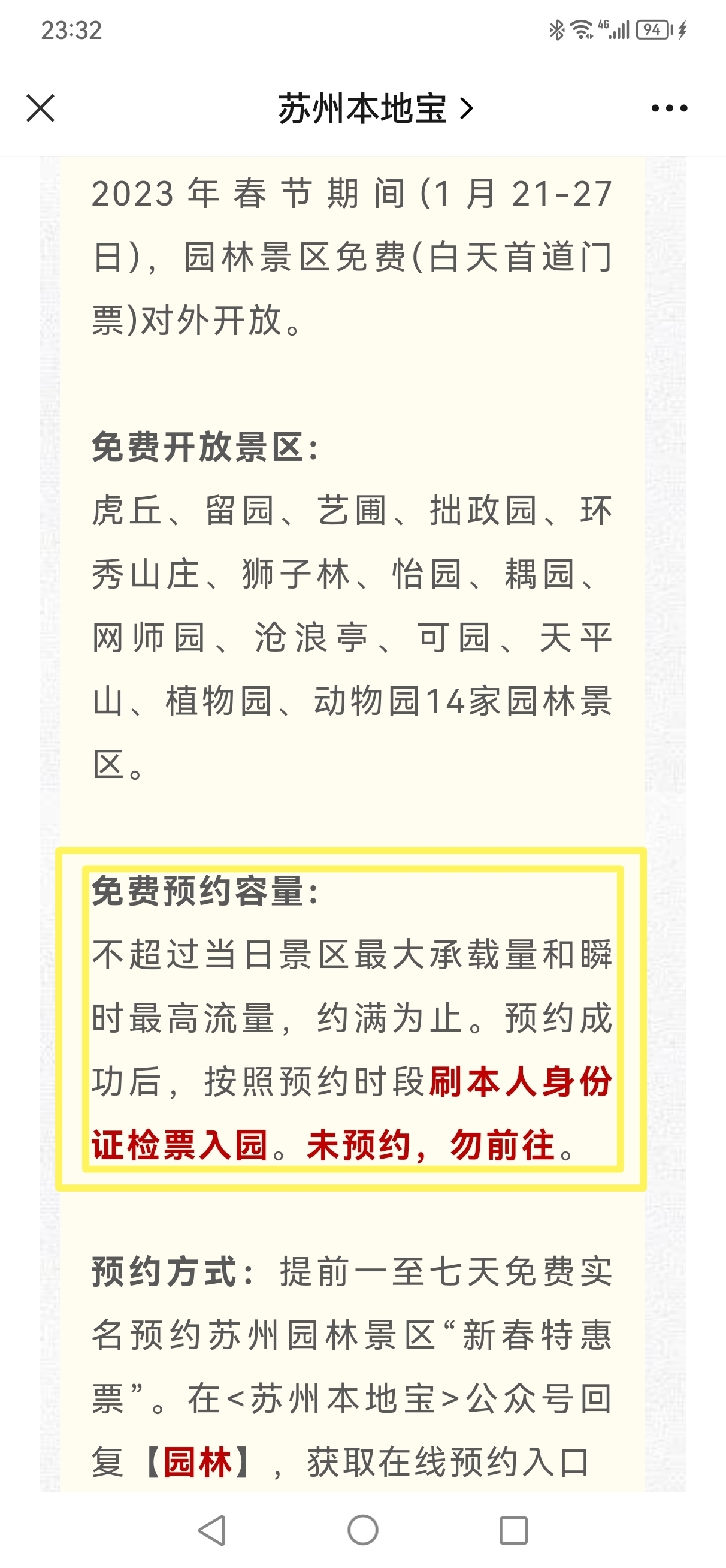 2023年春节期间(1月21-27日),园林景区免费(白天首道门票)对外开放。