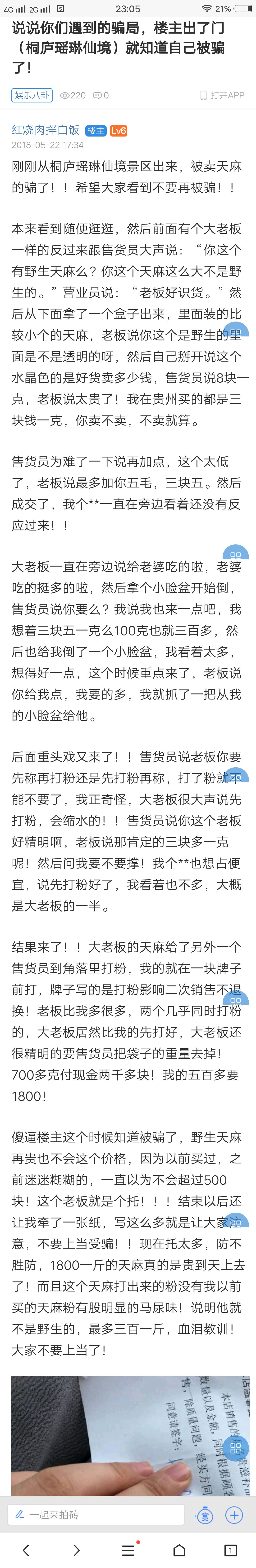准备去瑶林仙境景点的,如果你有幸看到这里,请你耐心看完,以免钱财甚至危险之灾。正文:景点确实有点看头,重点在逛完出来的时候,危险在一步步向你走来,注意注意,在洞里出来后下山的途中,有个卖中药的房间,其中有灵枝天麻等,危险也就在此,此时会有个广东口音的装着老板样子和店员讲价说东西是假的,这时候店员会拿出不同的东西让这个“老板”看,老板会说太贵,什么他老婆经常吃,也就3块左右,这时店员会答应3元卖并免费磨粉,很多人会有遇到内行人的感觉,也想一起买,就就是上当的第一步,“老板”的一份被拿到里面打磨,你要的在外面打粉,并说打了粉不能退,有多少是多少,这个人是托,托托,切记,已有多人上当受骗,如出一辙,千万记住不要被骗。网上很多相同的经历。