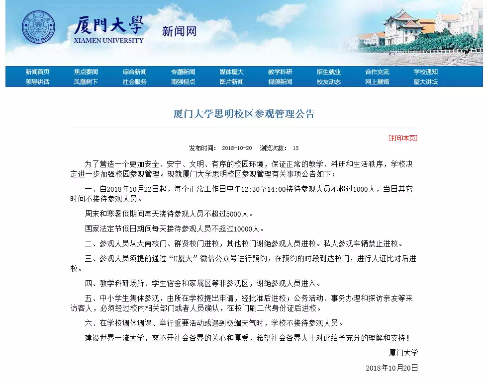 为了营造一个更加安全、安宁、文明、有序的校园环境,保证正常的教学、科研和生活秩序,学校决定进一步加强校园参观管理。现就厦门大学思明校区参观管理有关事项公告如下: