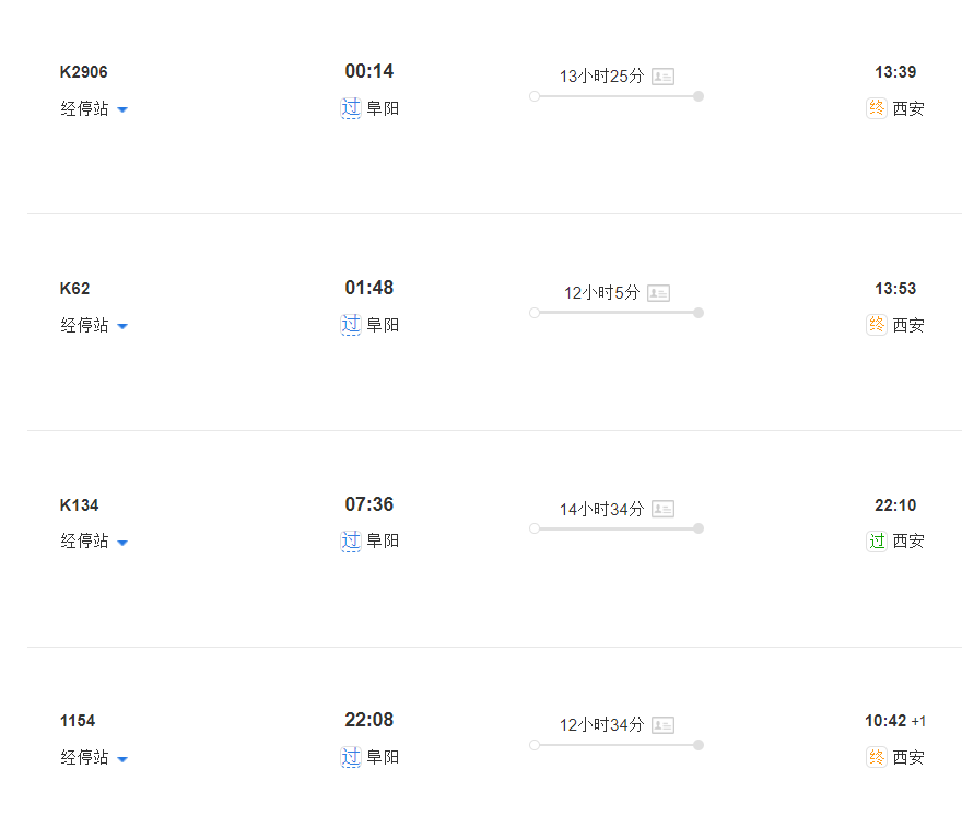 你好,阜阳到西安有四班车,全都是过路车。你查到车次旁边有个”过“字那就是过路车。