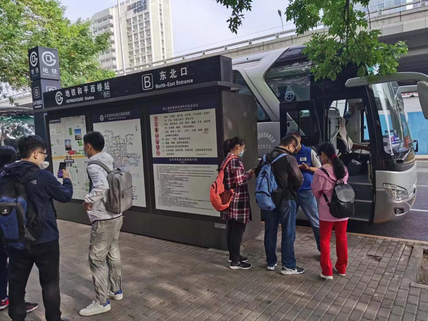 提前一天夜里23点之前预定好车票,导游也会提前跟联系强调第二天的集合时间和地点(工作日:早8点--8点半;节假日:早7点半--8点,上车点:地铁五号线和平西桥站B出口),因为我们就住在五号线地铁沿线,不用早起,提前半小时出发就好了,到了和平西桥站下车,导游提醒先去个卫生间,怕老人和孩子坚持不住(这点细节很贴心)