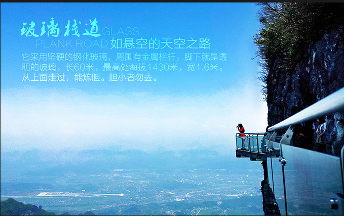 天门山森林公园景区内玻璃栈道最高处海拔1430米,特别刺激,值得挑战
