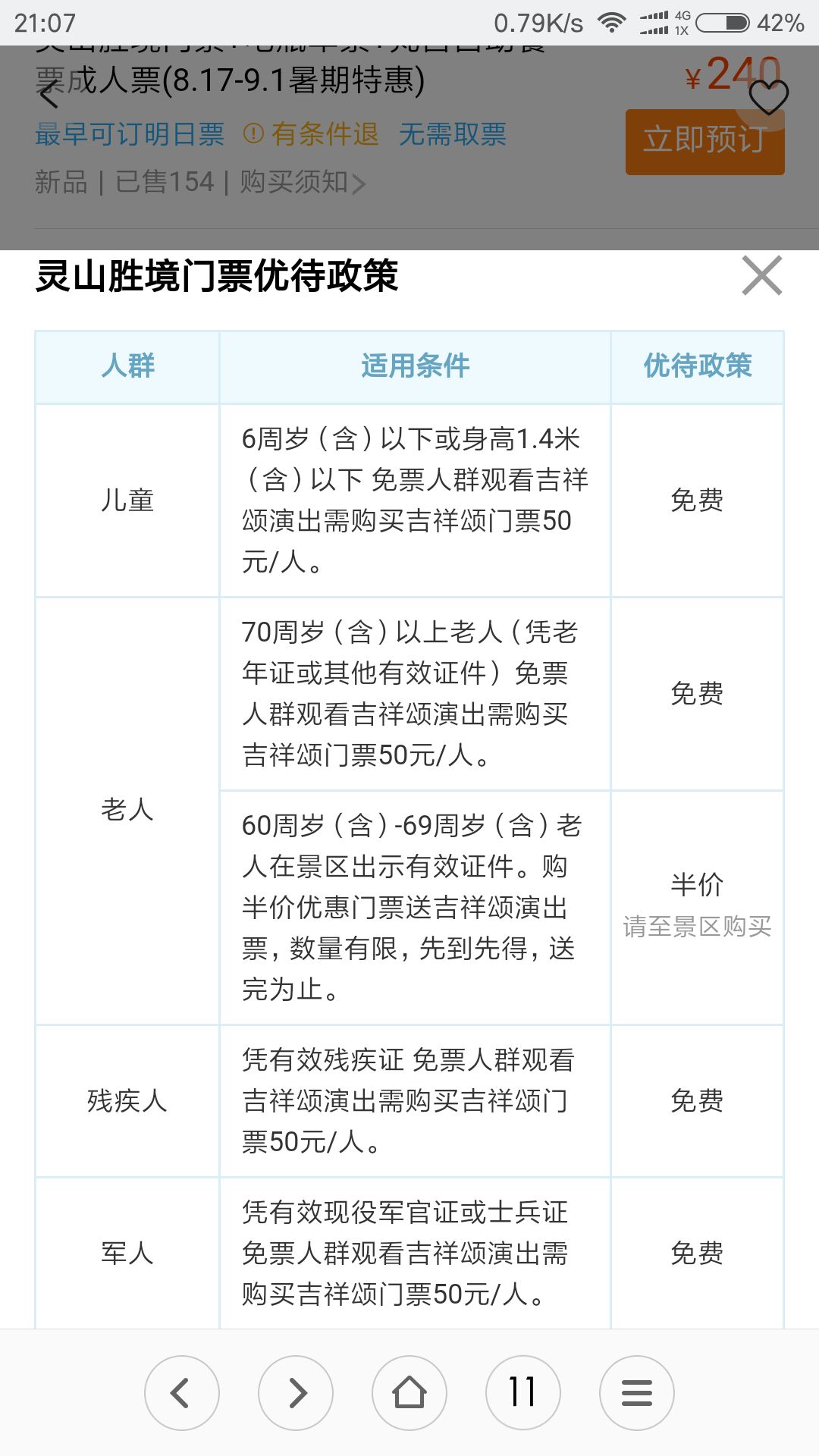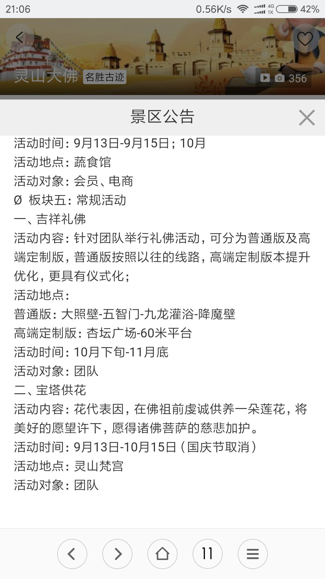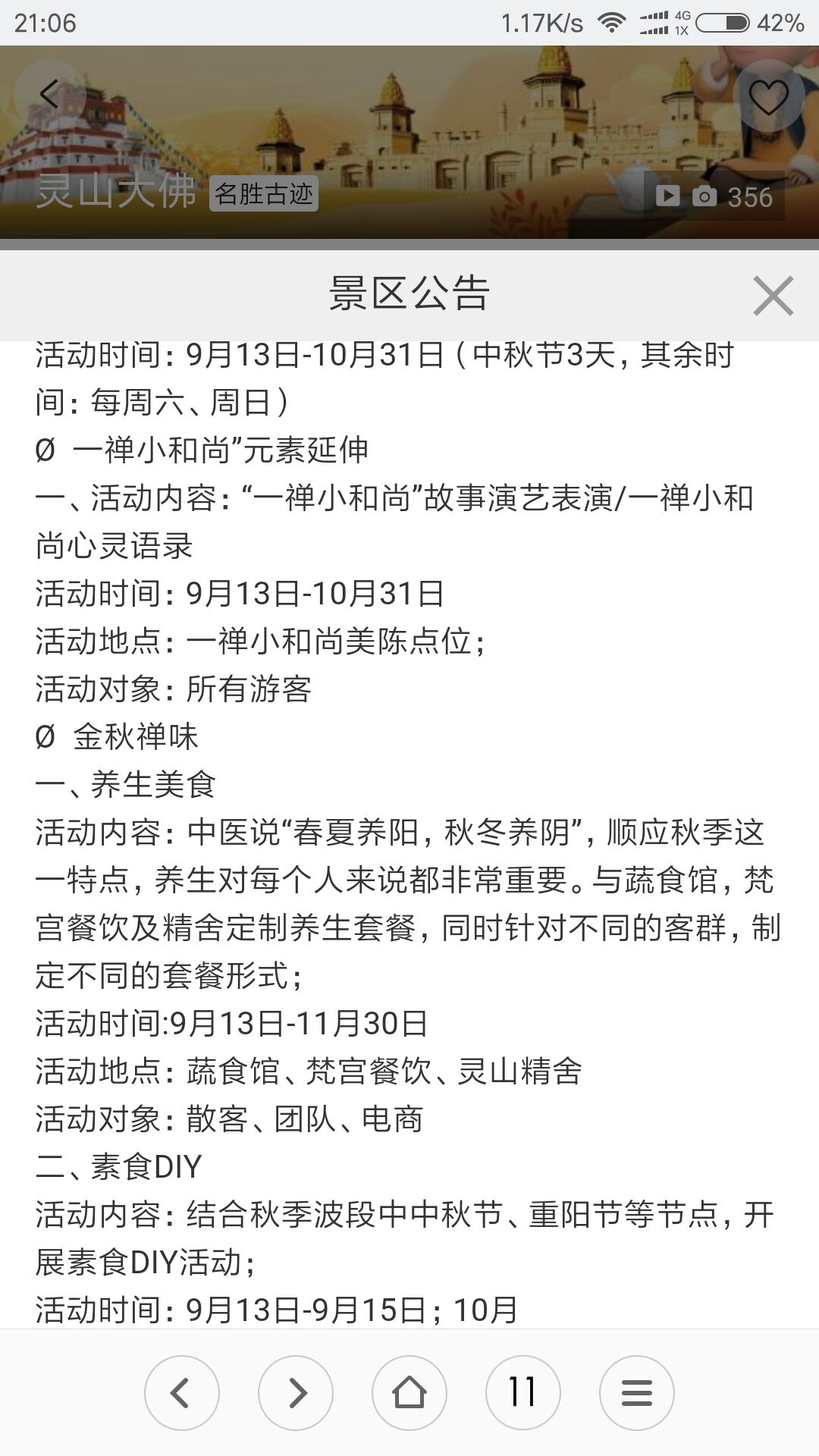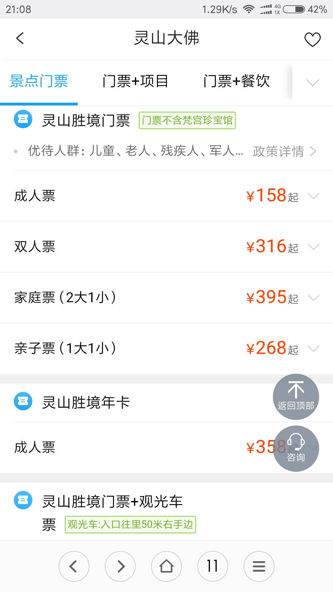 60-69周岁老人持身份证景区购买半价票,送吉祥颂演出票。限入园一次,景区内有餐厅:灵山斋餐食、灵山胜境蔬食馆自助餐、梵宫自助餐……
