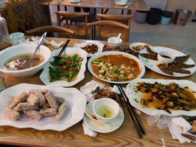 牡蛎饼,鲟饭,挂霜芋头,茶叶虾,春卷,红烧鲳鱼,椒盐羊排,生醉虾,开胃鱼头,爆炒海蜇皮,槟榔芋,福鼎海鲜,海鲜炒面,大肠鸭血煲,手撕羊排,焖三鲜,什锦螺,椒盐梅丁,特色醉蟹,炒时蔬