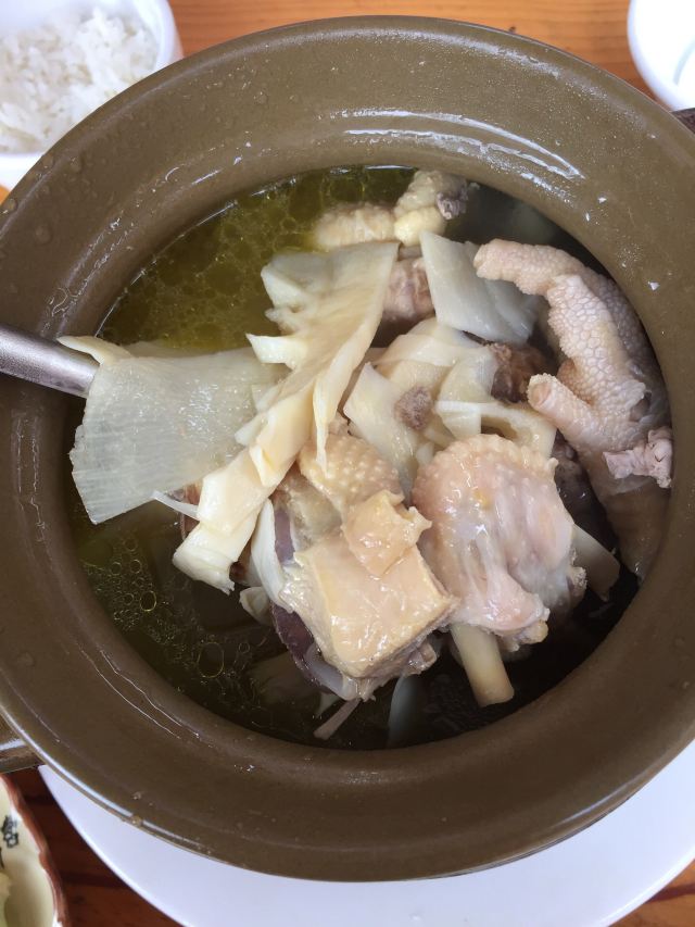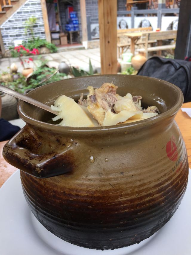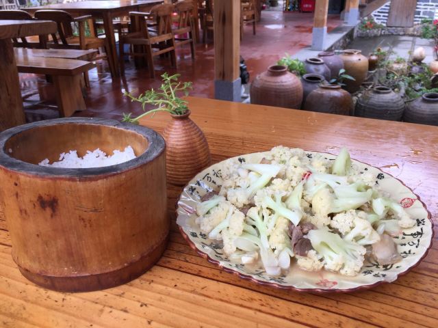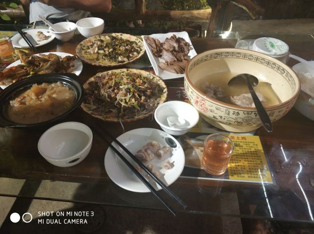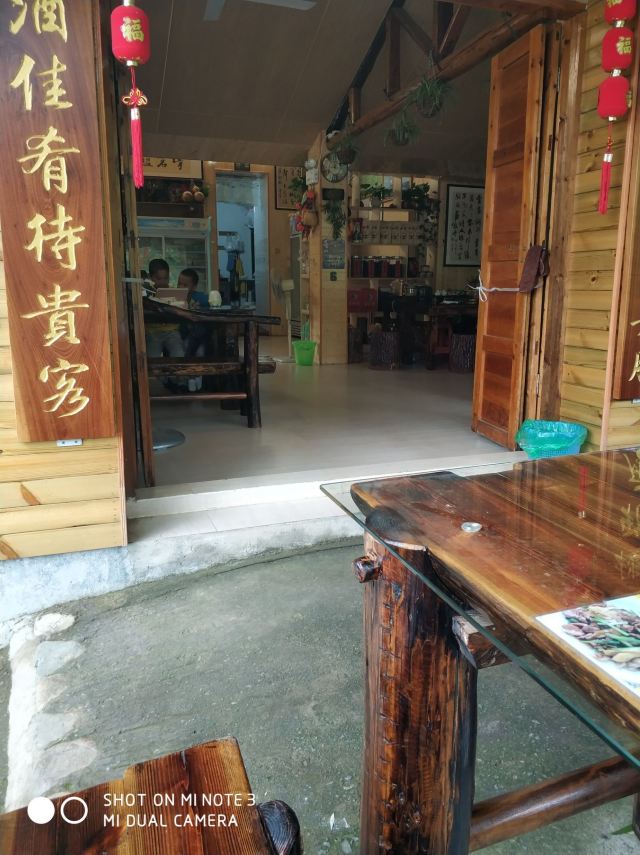 小店位于云水谣景区内,环境优雅舒适,古道边大树下就餐别有一番意境,私下跑去厨房看简师傅炒菜,厨房内干净卫生,简师傅的厨艺更是不错,烧得一手正宗农家菜,听老板娘说,店内的字画一部分出自简大厨之手!极力推荐此店的清蒸光鱼,和竹筒贵妃鸡,味道那是相当的Delicious。