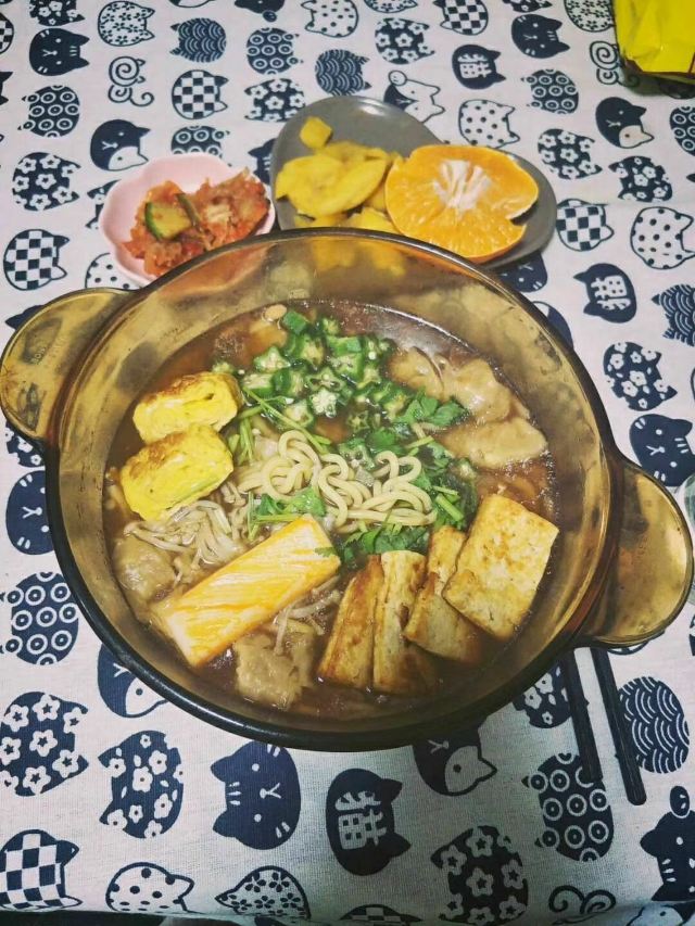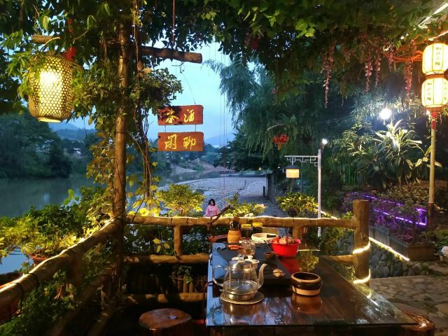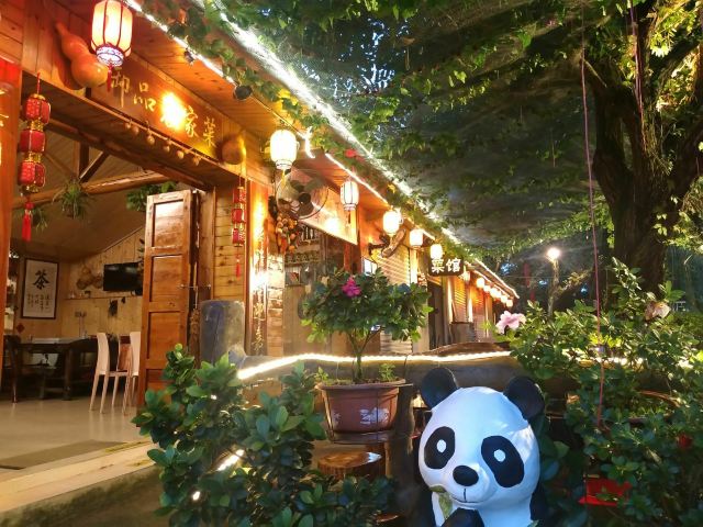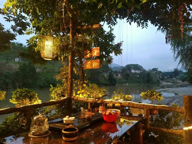 一个位置处于河边的餐饮店铺。装修中等,悬挂了比较多彩灯饰品,在几个店铺中算较引人注目的;餐食花样较多,服务员态度热情;菜品味道不错。