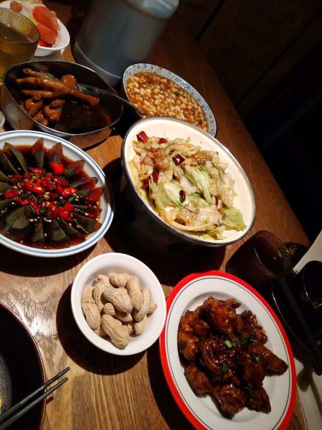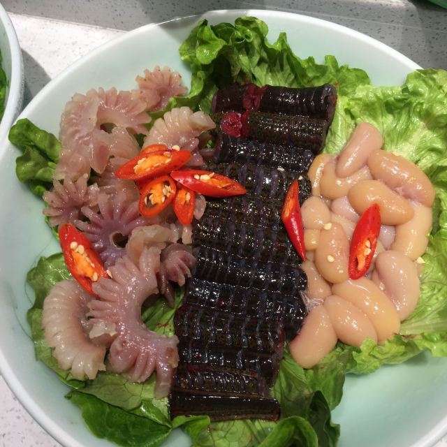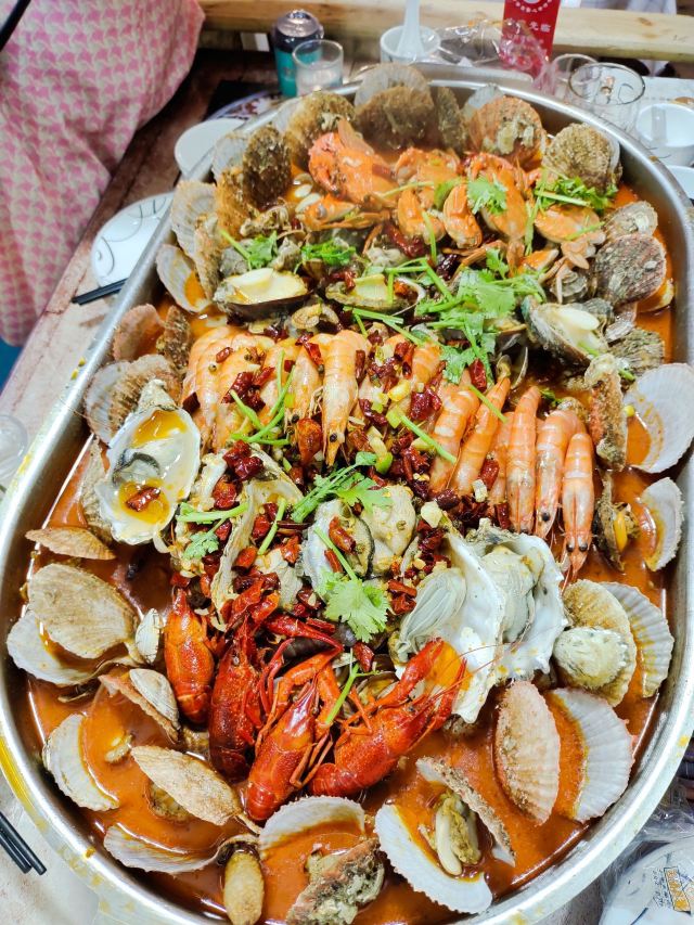 水煮黄蚬子,捞拌海螺,炒杈子,面条鱼炒鸡蛋,鸭绿江啤酒,酱焖八爪鱼,干锅有机菜花,黑蚬羹,大香蕉汽水,象拔蚌,朝鲜冷面,黄蚬子,面条鱼,盐水大虾,酱虾,韭菜炒叉子,椒清远鸡