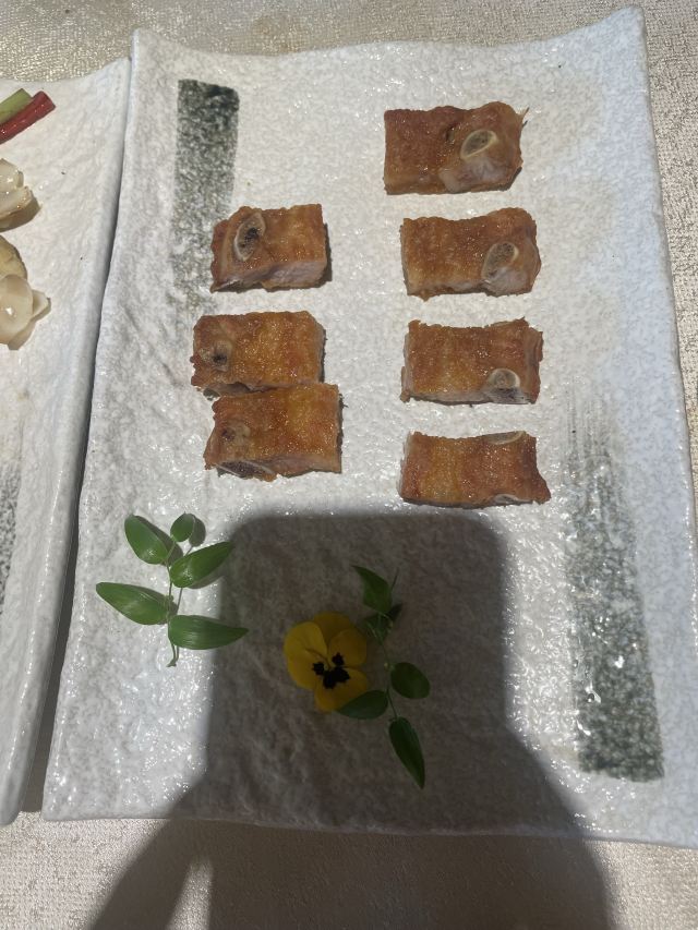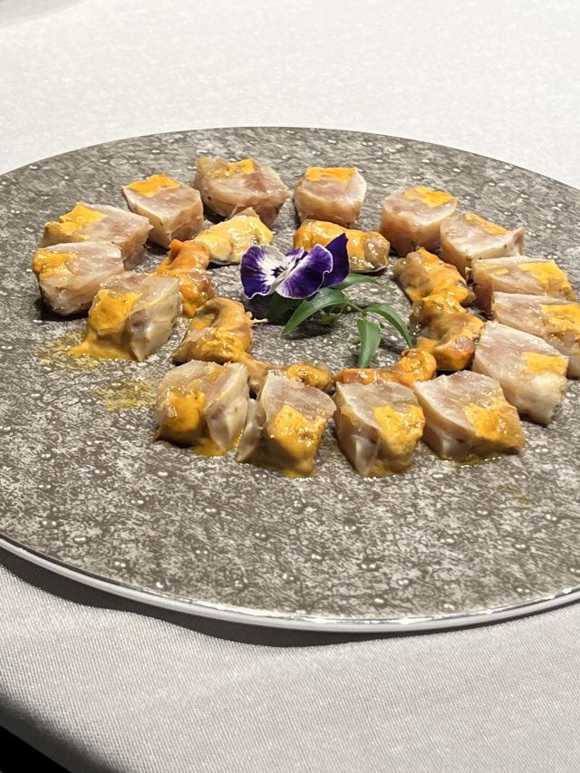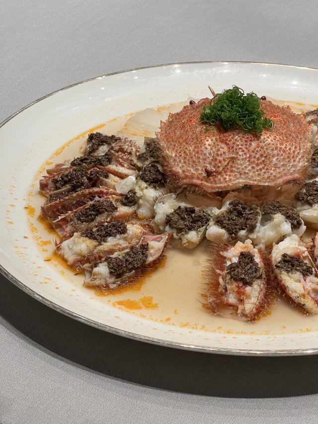 脆皮金沙参,潮州刺头苦瓜煲,36个月潮州老鹅头,脆皮乳鸽,生腌三门膏蟹 ,上汤布仔豆腐
