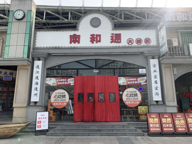 NAN HE TONG2025年1月11日来的。 这家店是在南通必吃榜推荐榜单上的本地家常菜餐厅,而且也是回上海的路上,所以自然就顺路过来了,可以说是值得拔草。 一到店,店内店外的南通“老底子”风格装饰就让人一秒入戏,整个店堂还原了上世纪80年代南通的街坊景象,很有年代感。 菜单子的菜式,也大多是以南通传统的经典家常菜肴为主,当然也有不少新的烧法,味道都挺好吃的。印象比较深的是99秒黄鱼和山泉水原汁文蛤,正应验了那句“好的食材往往只需要简单的烹饪”。其它一些菜也很不错,南通的菜和上海很类似,但是在这里是能吃出南通的特色的。 这家店的服务也非常好,虽然店里生意忙,但是服务员还是能在第一时间响应顾客的需求。在这家店吃饭不用担心停车问题,店所在的地方停车位很多,而且店内用餐可以享受3小时的免费停车,走之前在收银台处理一下即可。